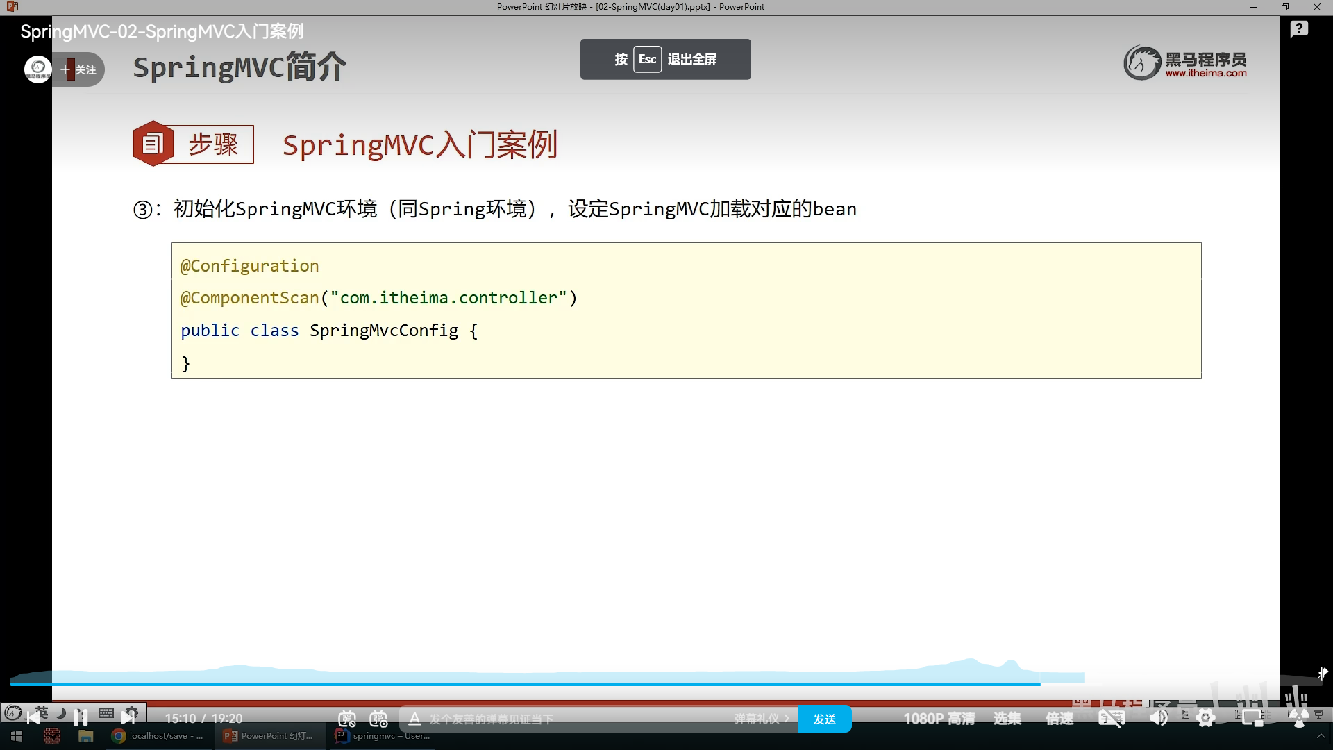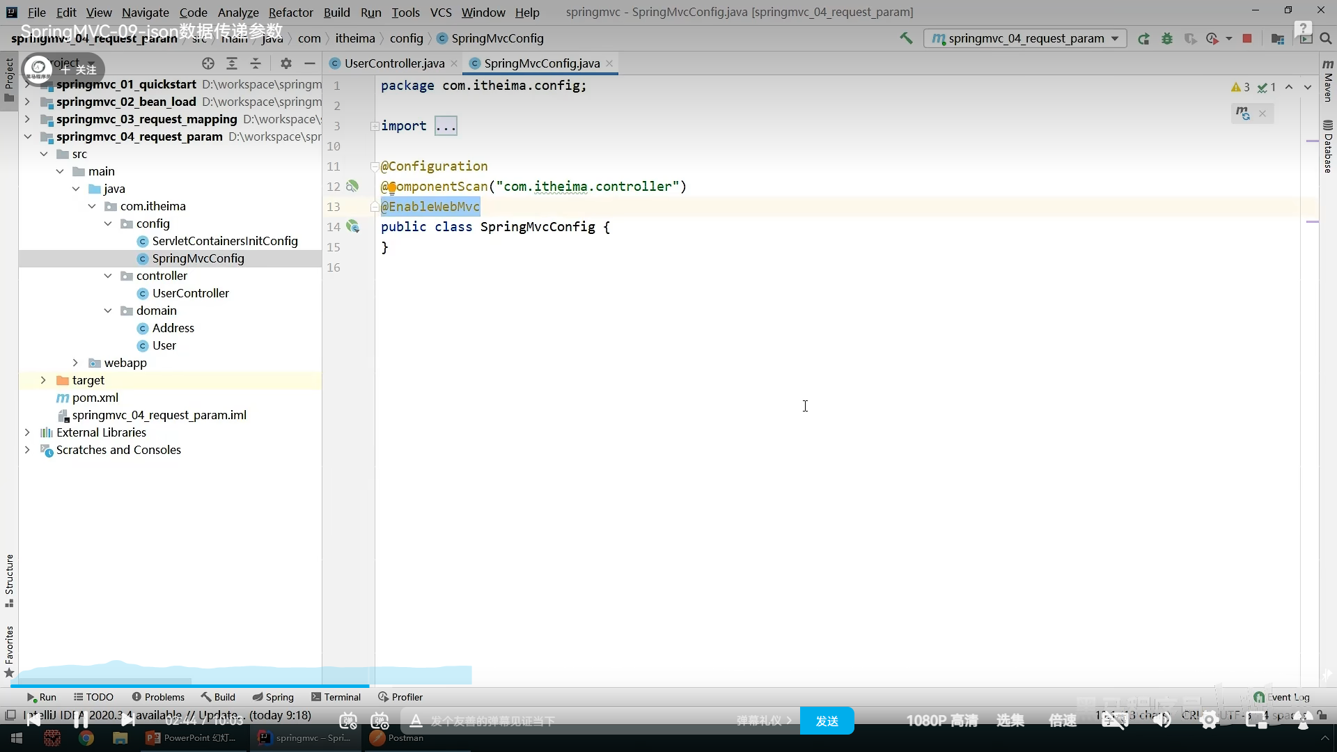 然后设置一个SpringConfig类来加载这个SpringMvc控制器类,就是初始化胡SpringMVc的bean