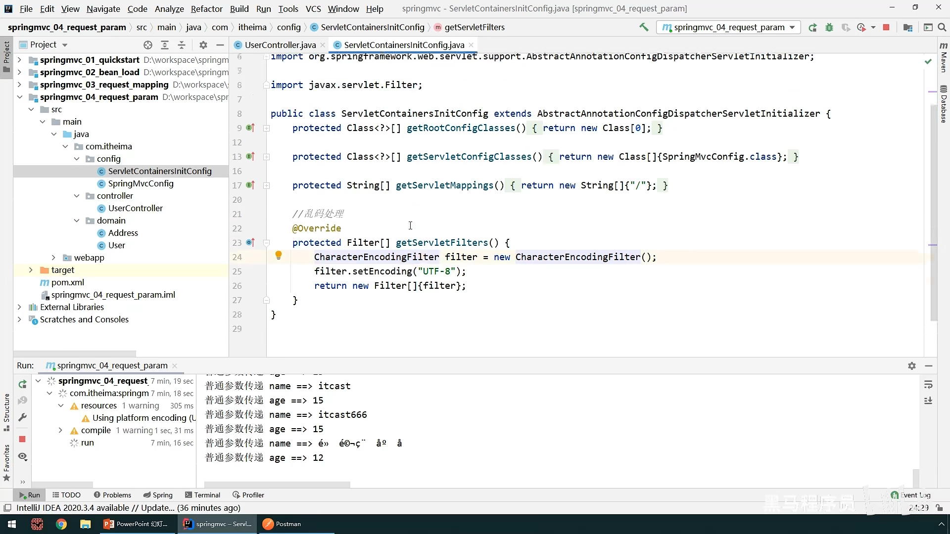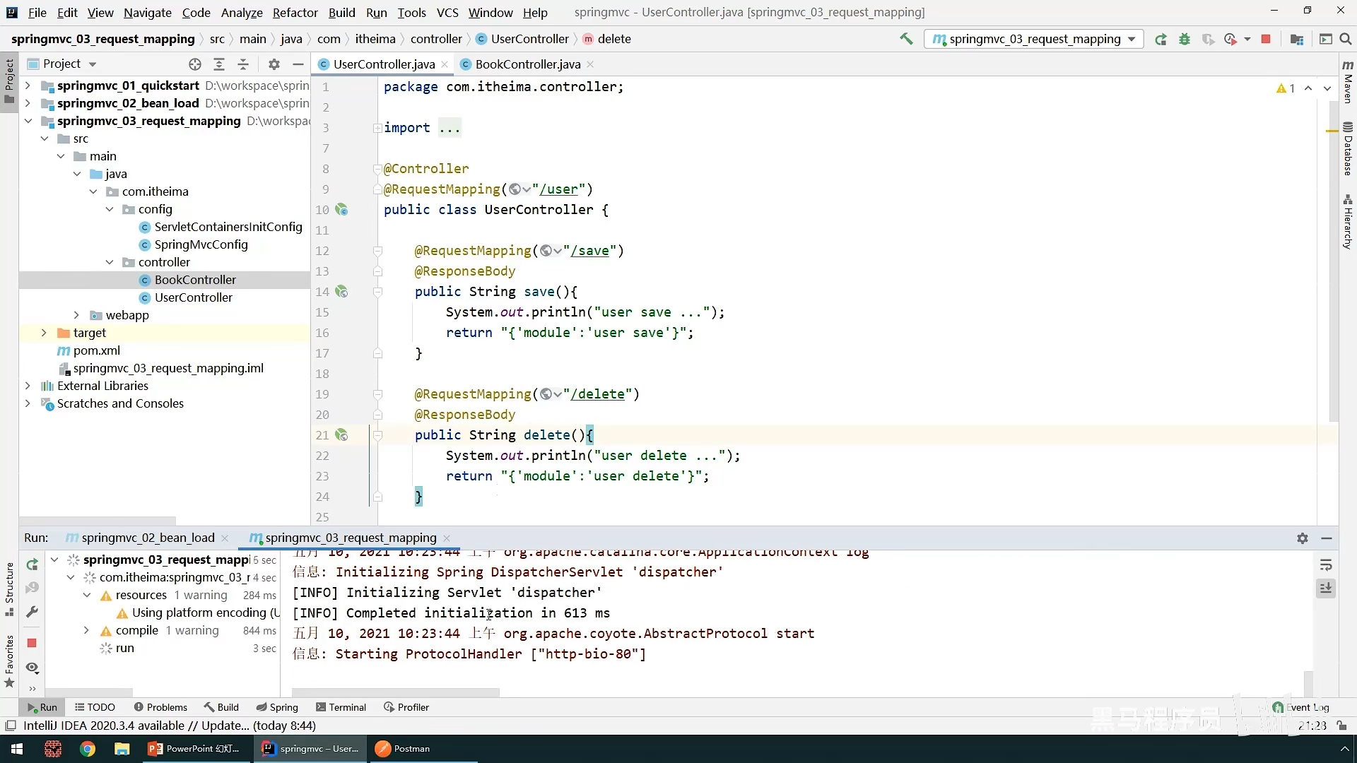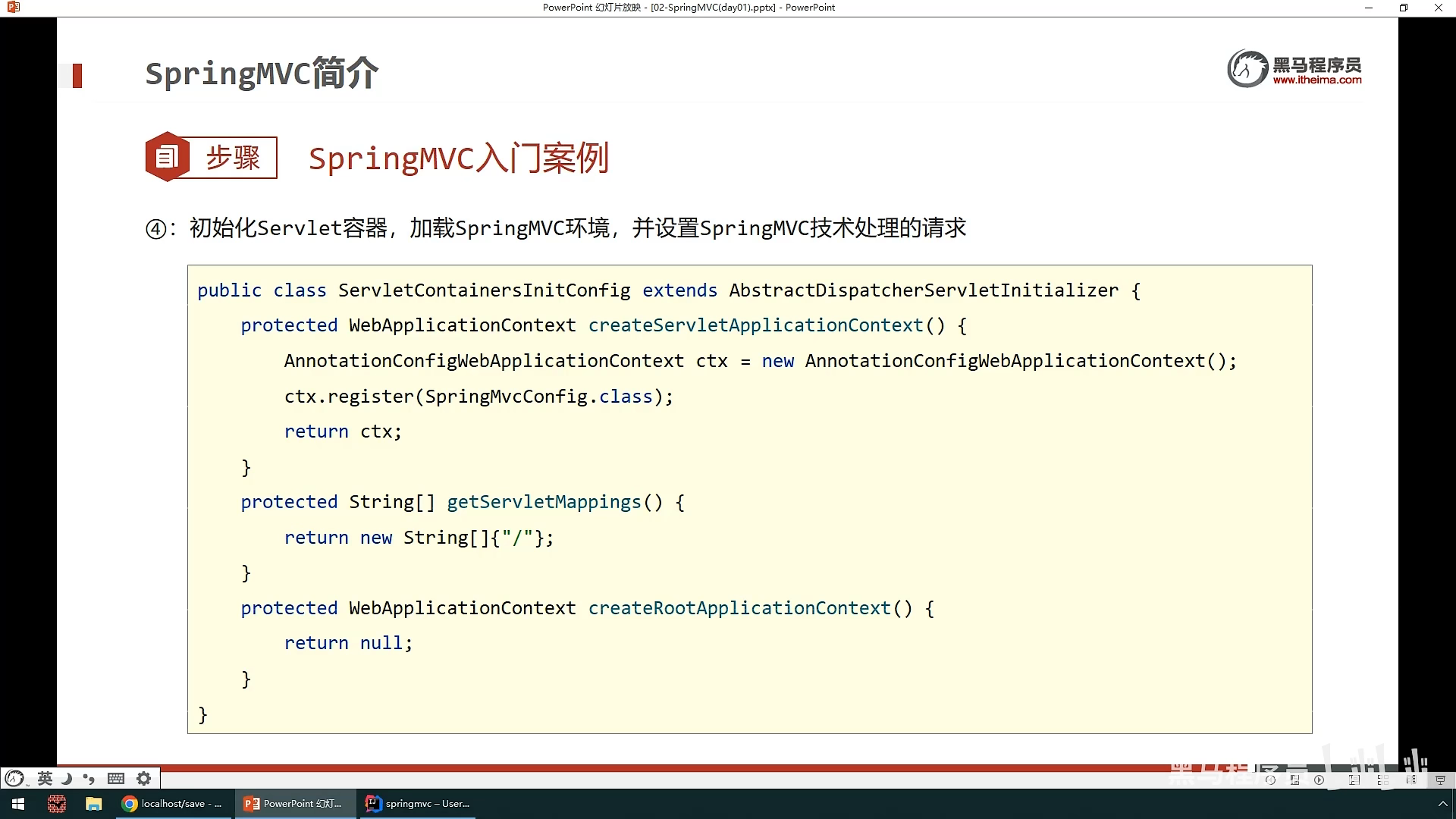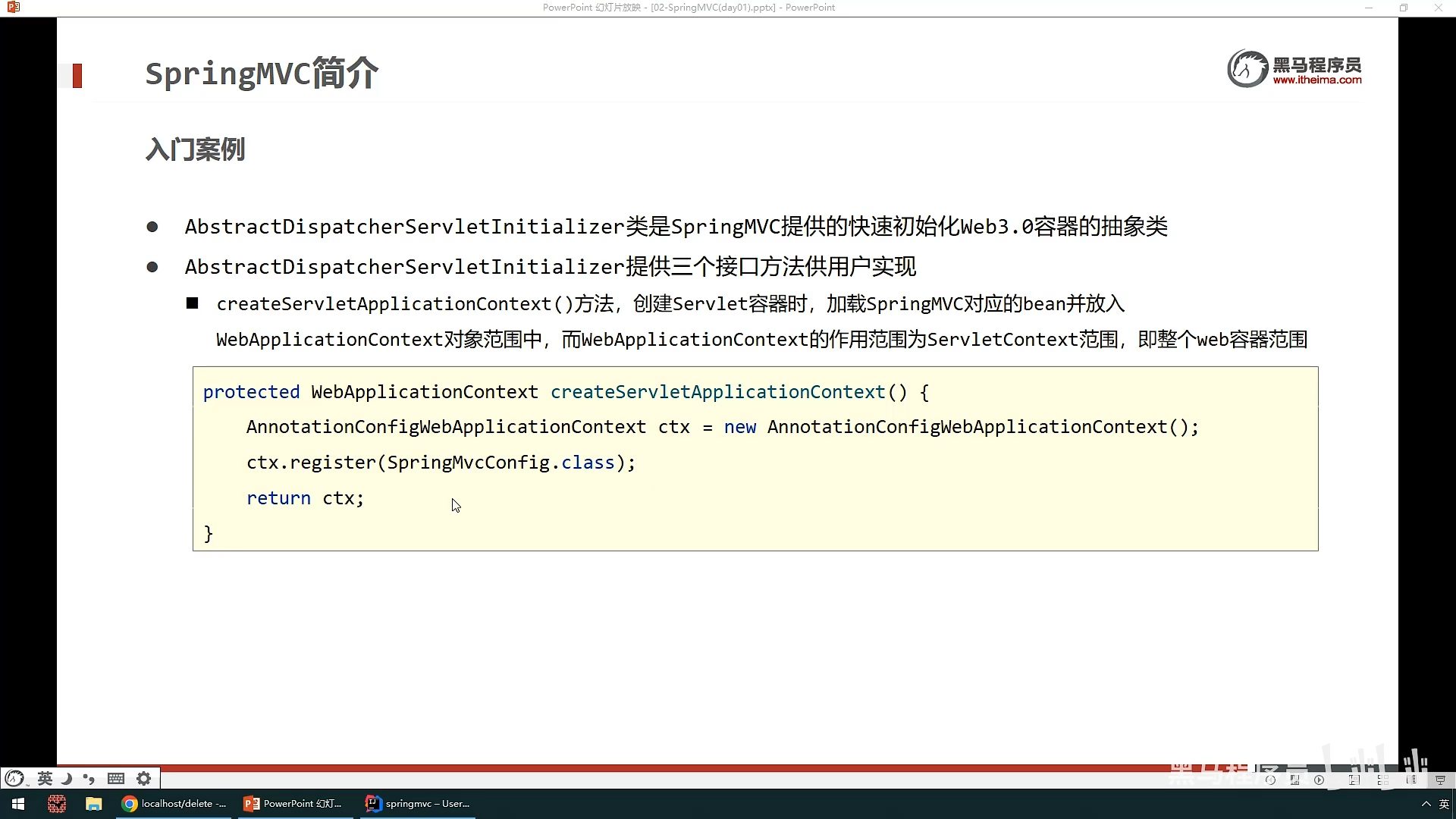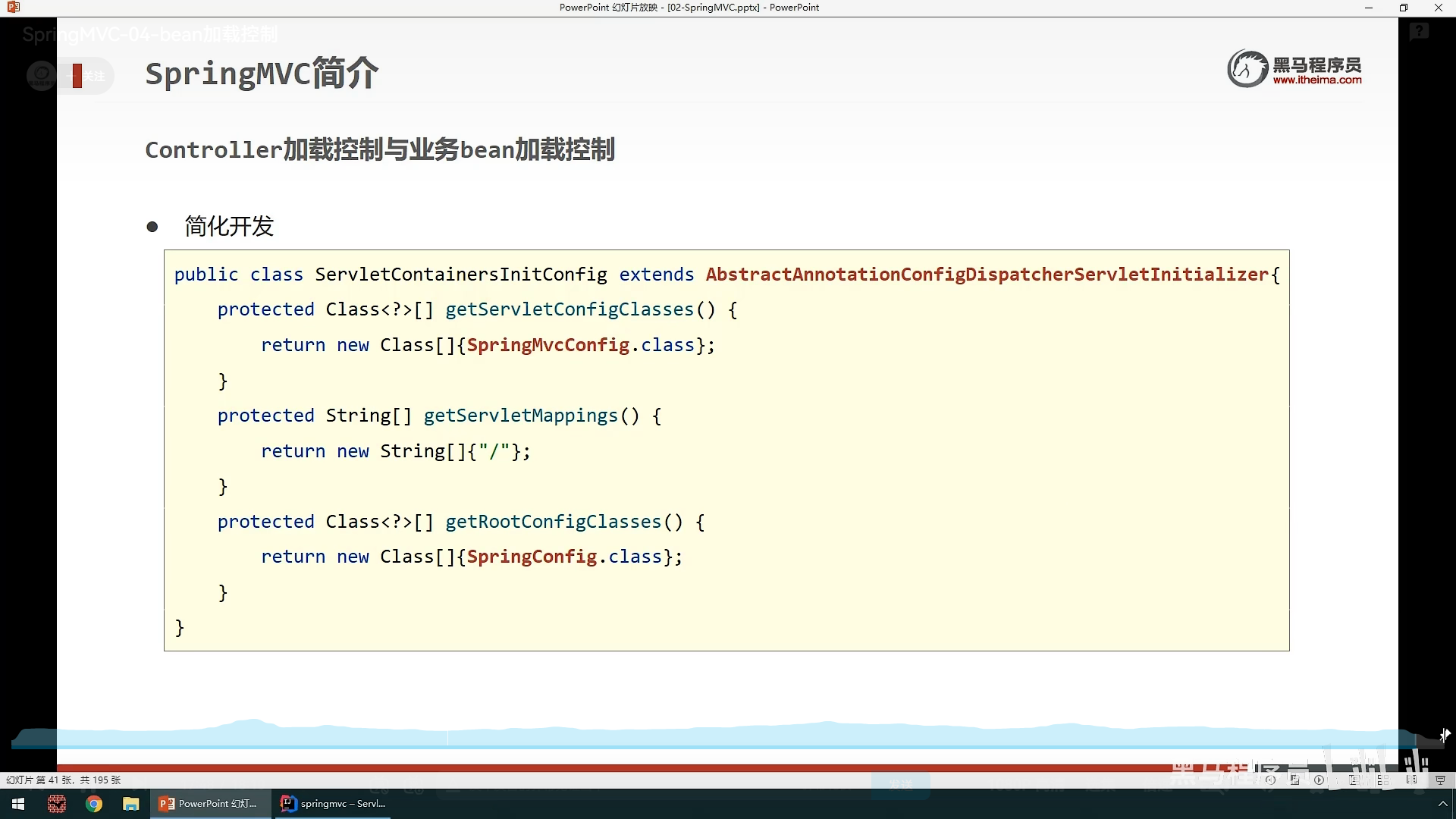 ,一个是加载SpringConfig,还有一个是设置访问路径,这里表名只要是带”/“都会被SpringMvc加载,还有一种更加简洁的方法