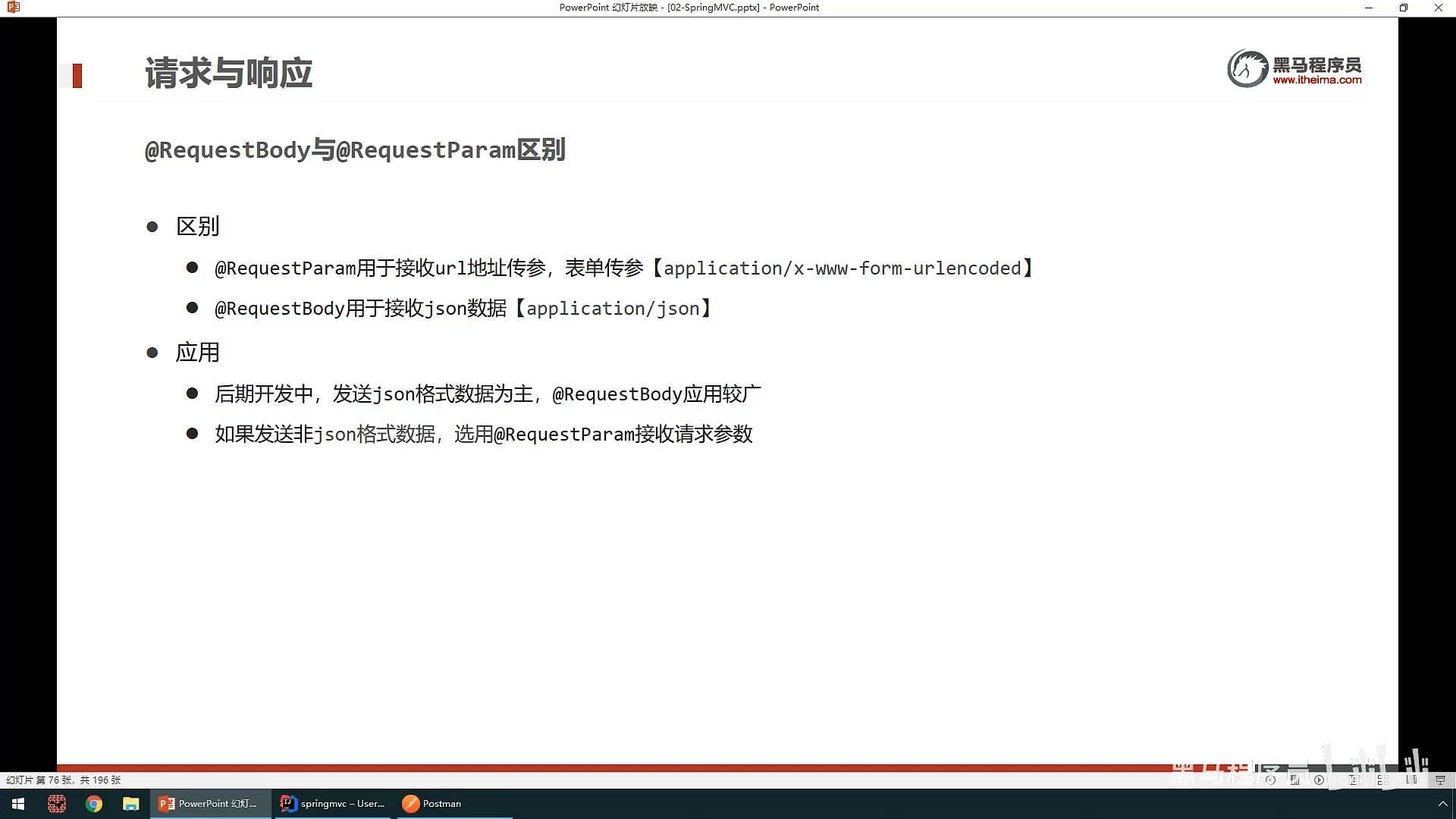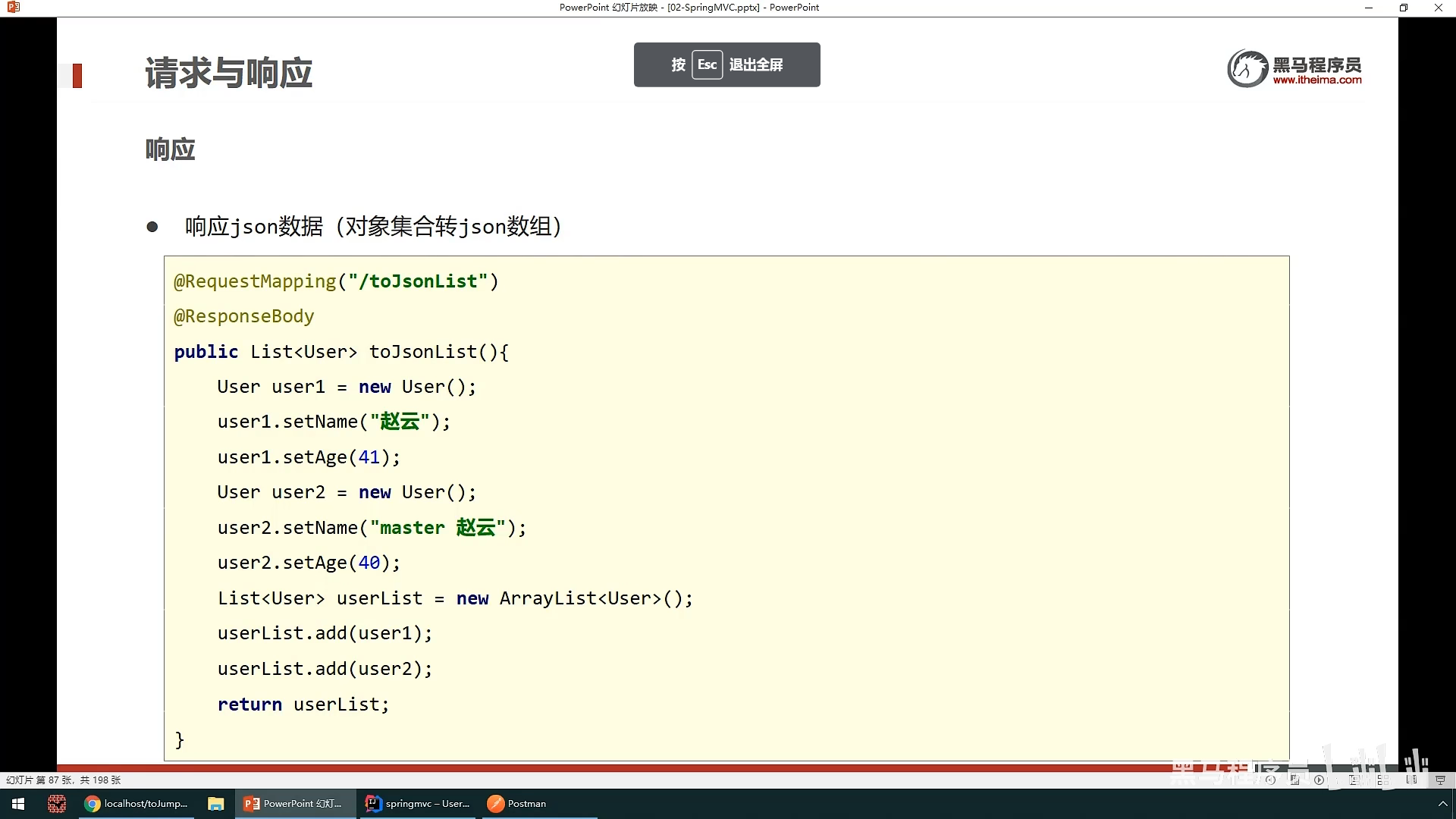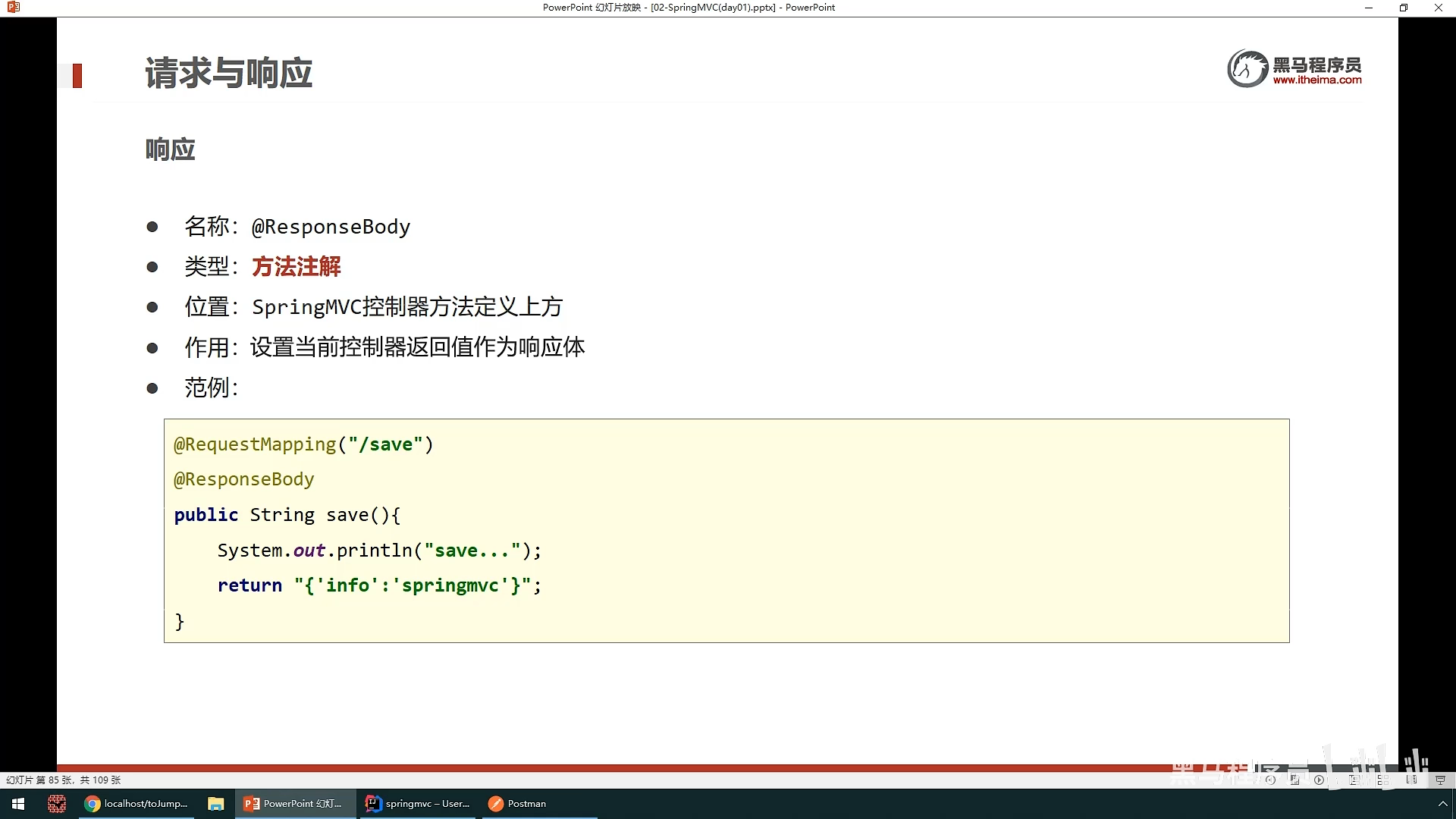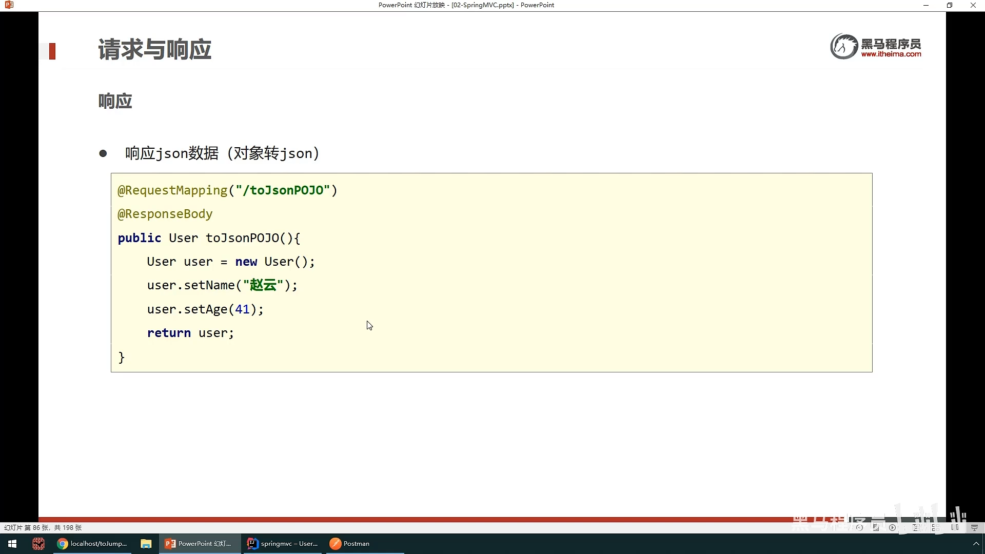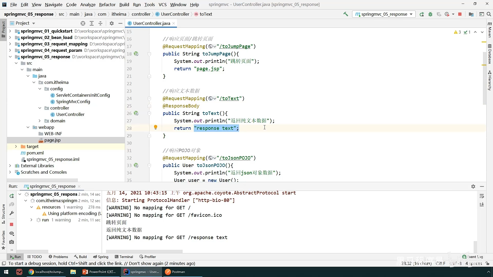 之后就是响应就是springMvc控制器传给网页的数据:其中分为响应页面(也就是跳转到 另一个页面)和响应数据(分为json数据和文本数据),响应数据不需要做什么,只要在方法上面设置@ResponeBody就可以