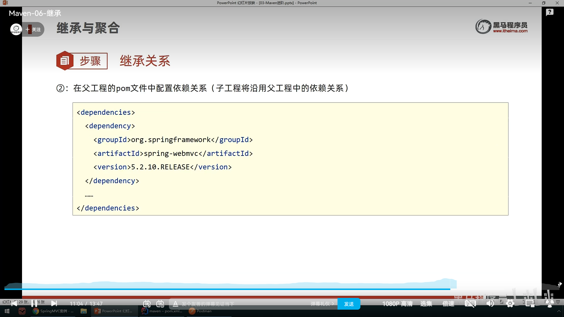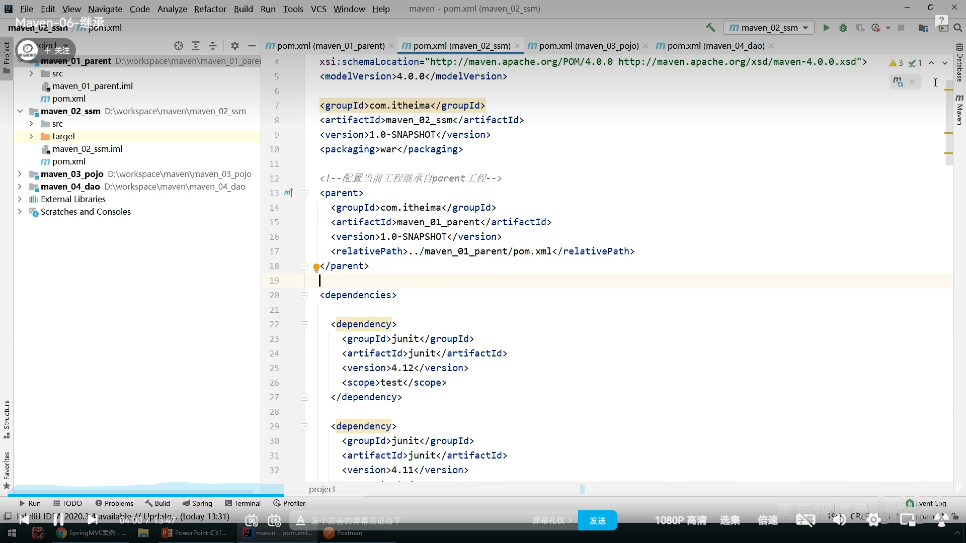 继承:大概意思是创建一个父类模块,然后在父类模块中设依赖,然后创建一个子类模块,在子类模块中,设置<parent>标签来继承父类模块,从而获得父类中的依赖