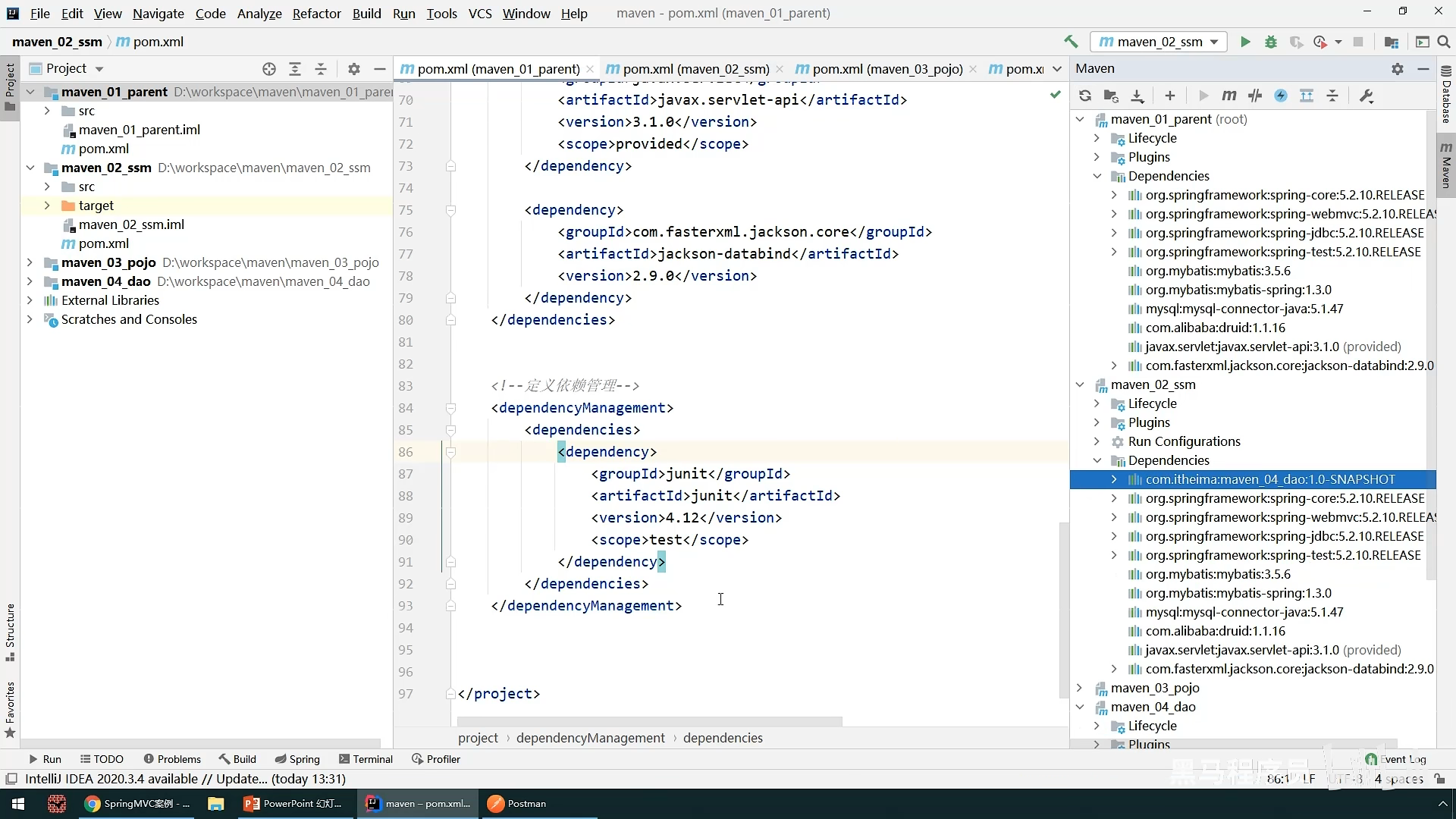 还有需要注意的是,在父类中可以定义供子类选择的依赖,就是把一些可以选择的依赖放到<dependendcyMagement>标签中,然后子类中可以选择的使用<denpendendcy>标签来导入需要的以来。
