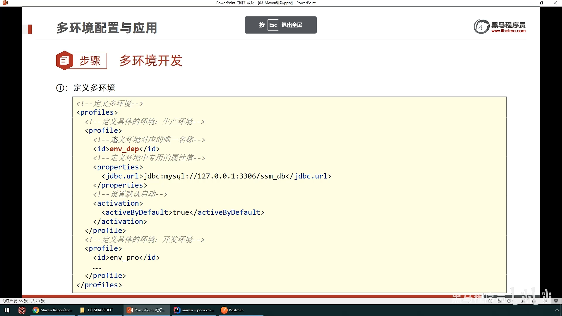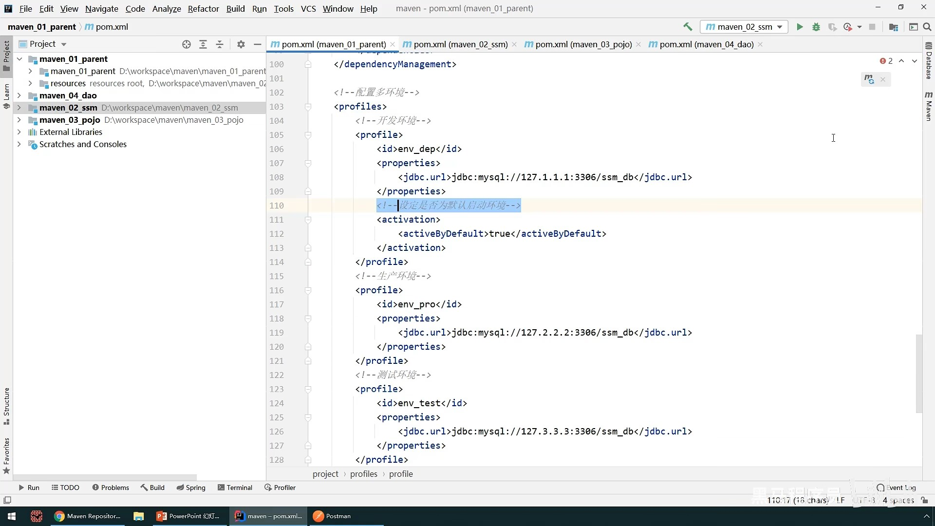 多环境开发,多环境开发是指,创建的模块可能会在很多的环境下运行,所以需要在<profiles>标签中设置环境: