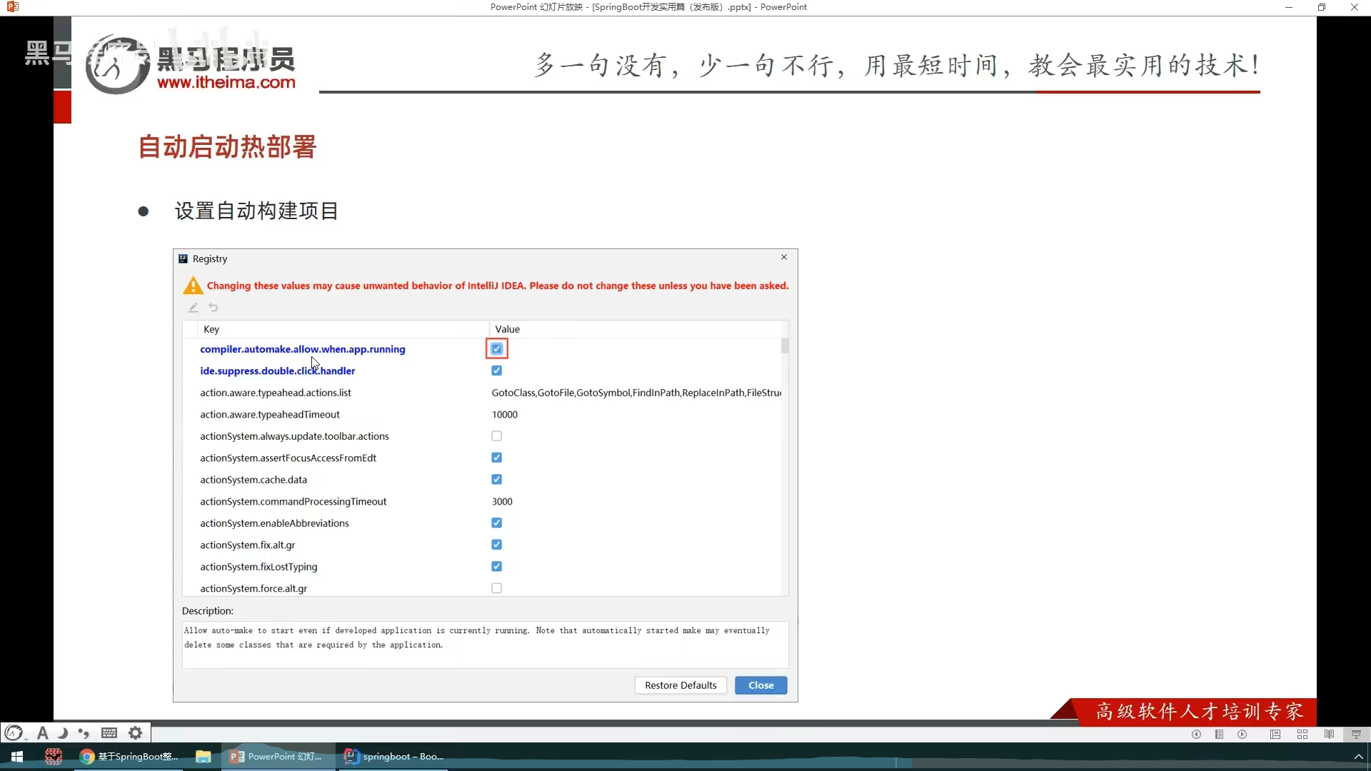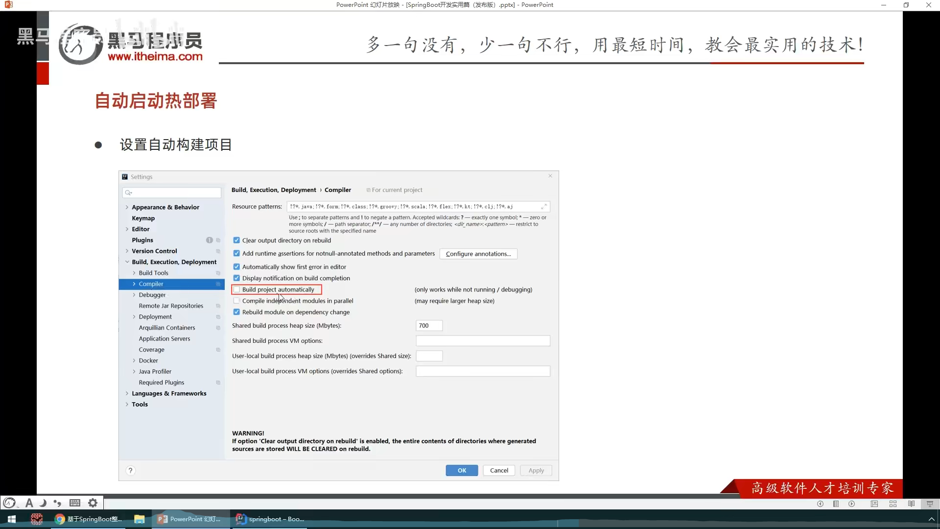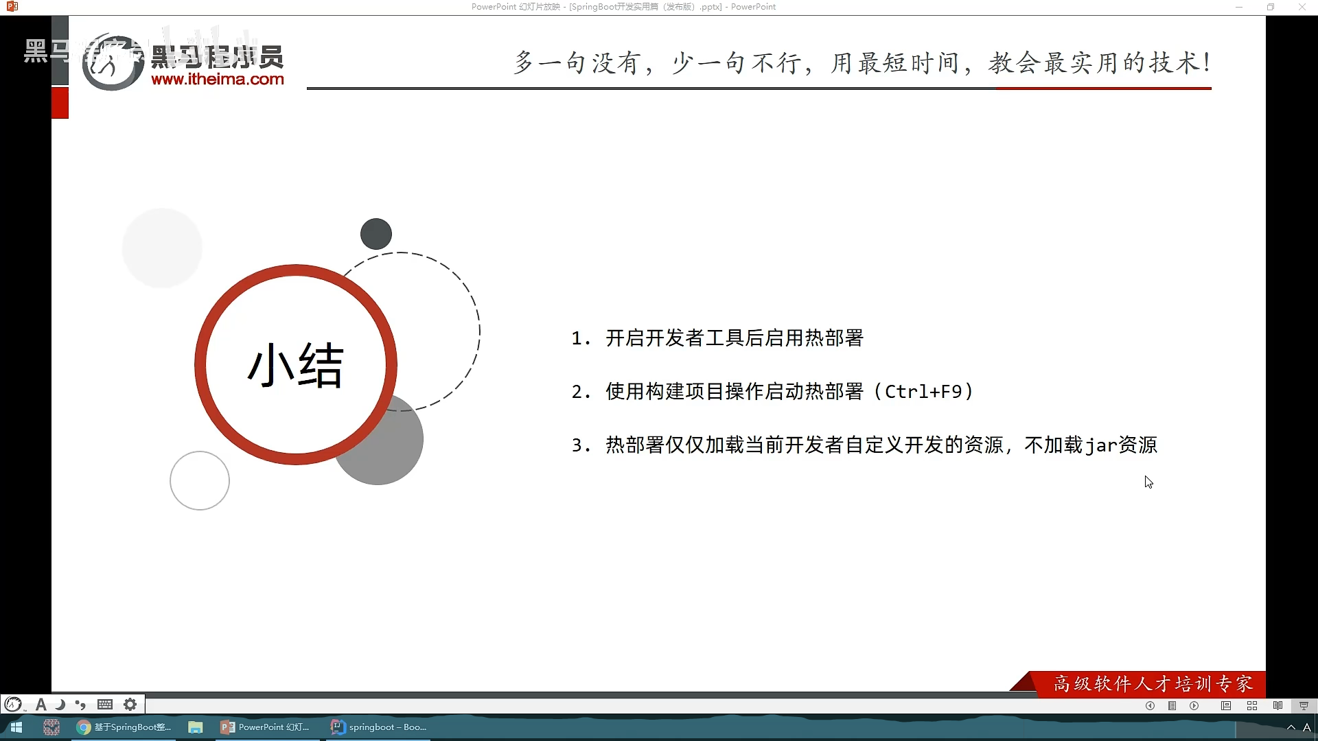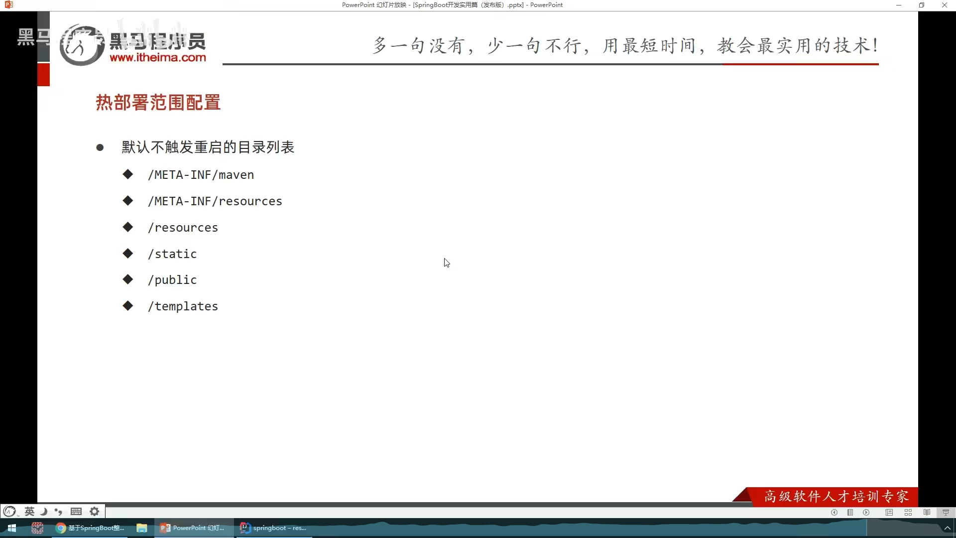 热部署是指springboot中,在编写代码时发现问题,而改动,却不需要重启服务器。比如,当我们改变表现层的某个方法中的代码时,我们需要重启服务器,来事改变生效,而使用热部署的话,就不需要重启服务器。