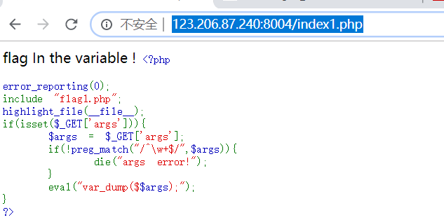 eval()函数存在命令执行漏洞 我们的目标是查看flag1.php中的flag 首先想到的是本地包含漏洞查看源码,或者上传一句话木马等思路 。而本题条件判断加了正则表达式判断,过滤了括号和引号等字符。无法构造!但输出时是$$args