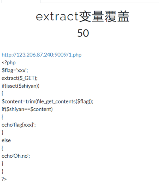 GET请求?flag=&shiyan=,extract()会将$flag和$gift的值覆盖了,将变量的值设置为空或者不存在的文件就满足$gift == $content
