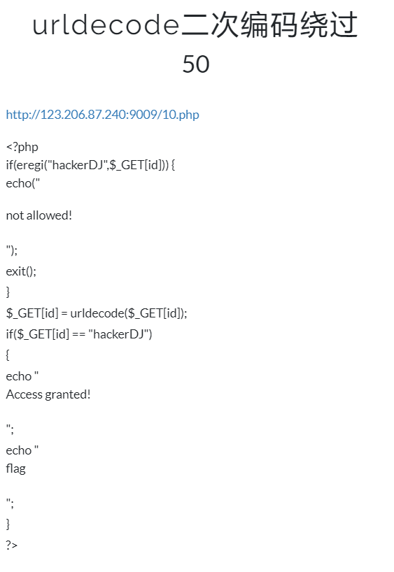 <?php $flag = "flag"; if (isset ($_GET['ctf'])) { if (@ereg ("^[1-9]+$", $_GET['ctf']) === FALSE) echo '必须输入数字才行'; else if (strpos ($_GET['ctf'], '#biubiubiu') !== FALSE) die('Flag: '.$flag); else echo '骚年,继续努力吧啊~'; } ?>
