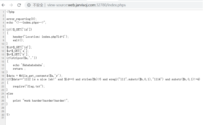 a:由data进行赋值:$data = @file_get_contents($a,'r') 而又有$data=="1112 is a nice lab!" 可以利用远程文件包含在allow_url_include开启时可以使用,但发现对$a有了.过滤所以还是data协议比较稳妥, 参数a使用data类型的url构造:a=data:,1112 is a nice lab!。(参考data类型的Url格式:把小数据直接嵌入到Url中)