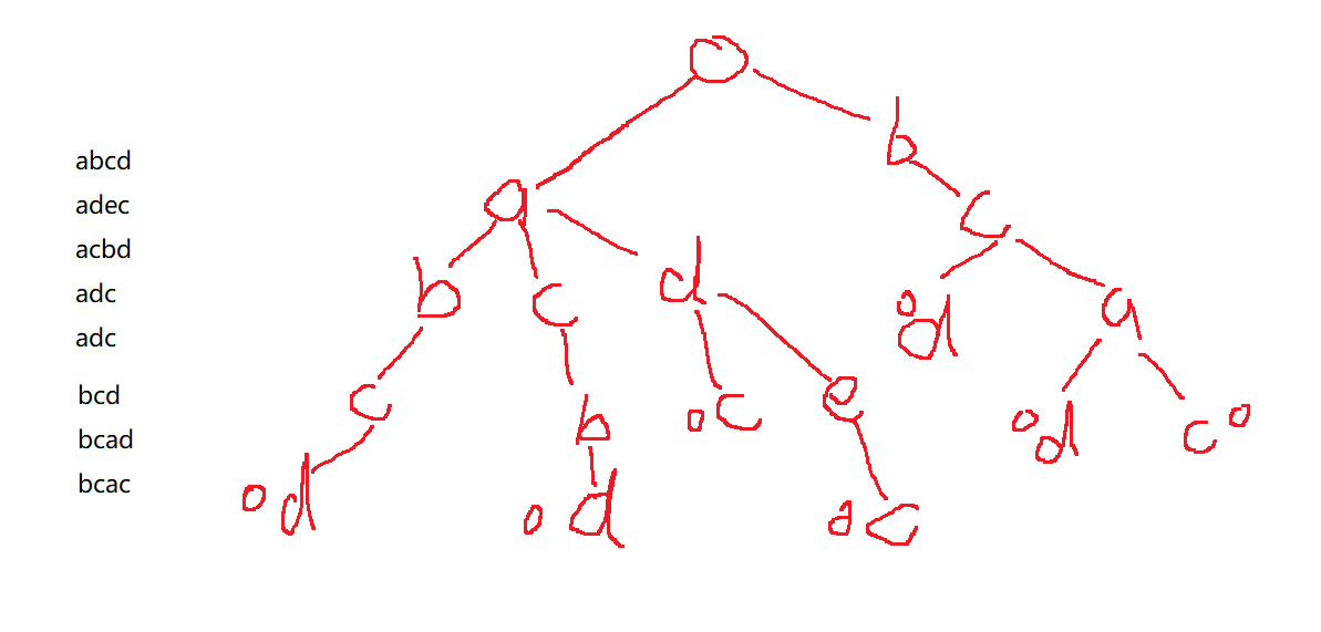 我们来着重讨论判断他和已有字符串是否相等,在这里的判断方法显然是循环遍历两个字符串,判断字符串长度以及每个位置是否相等。那么,在循环遍历所有字符串的过程中,不难发现,对于部分相等以及完全相等字符串,从字符串第一个字符起,总会和目标字符串有一个公共部分。那么,我们是否可以对于字符串每一个位置(对于数的每一层)只存储一个字符串该位置出现的字符,使得所有字符串共用一颗树(如上图)。这样在大大减少时间复杂度的同时,空间复杂度也得到的减小。