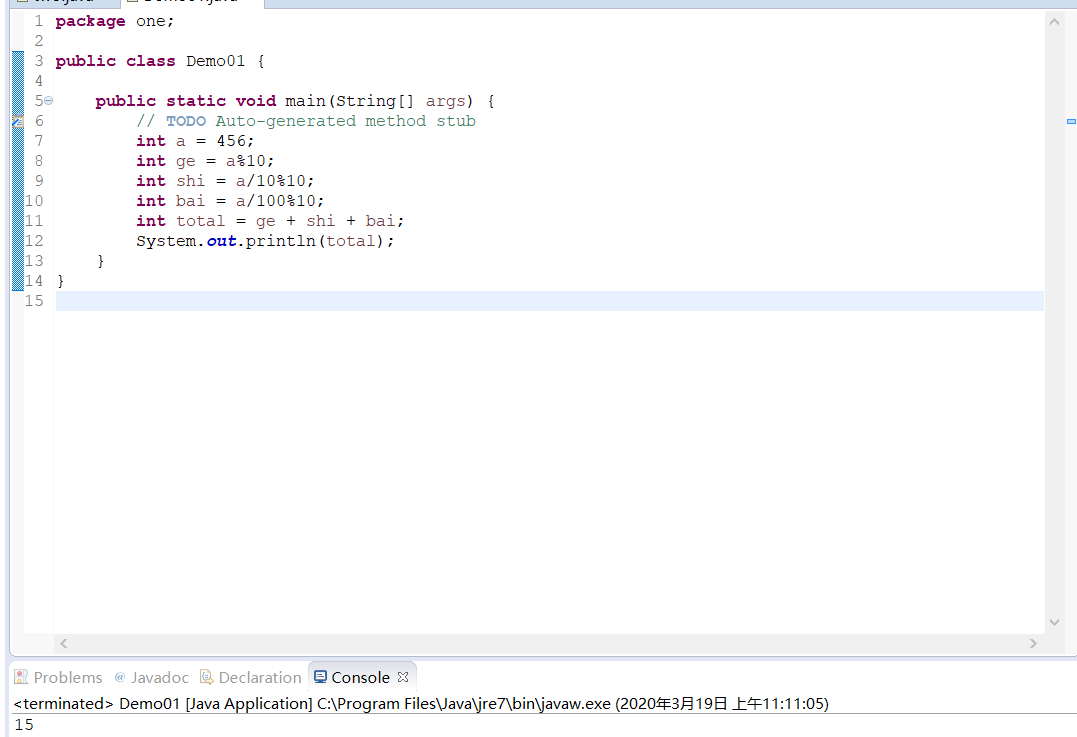 package one; public class Demo01 { public static void main(String[] args) { // TODO Auto-generated method stub int a = 456; int ge = a%10; int shi = a/10%10; int bai = a/100%10; int total = ge + shi + bai; System.out.println(total); } }