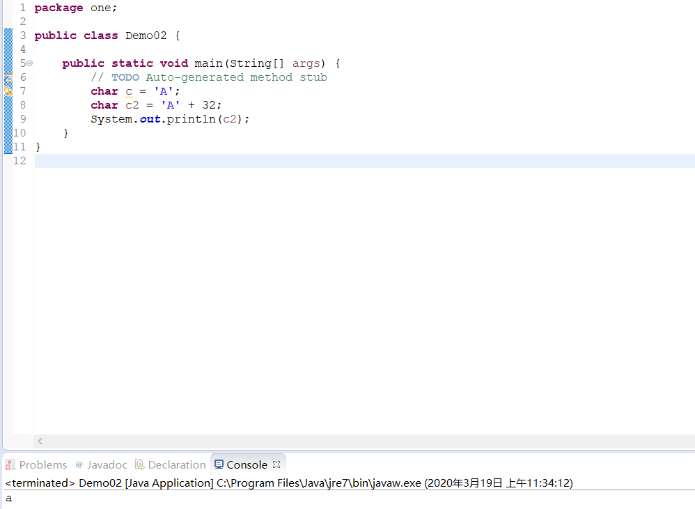 package one; public class Demo02 { public static void main(String[] args) { // TODO Auto-generated method stub char c = 'A'; char c2 = 'A' + 32; System.out.println(c2); } }