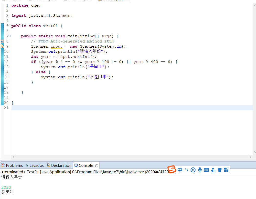 package one; import java.util.Scanner; public class Test01 { public static void main(String[] args) { // TODO Auto-generated method stub Scanner input = new Scanner(System.in); System.out.println("请输入年份"); int year = input.nextInt(); if ((year % 4 == 0 && year % 100 != 0) || year % 400 == 0) { System.out.println("是闰年"); } else { System.out.println("不是闰年"); } } }