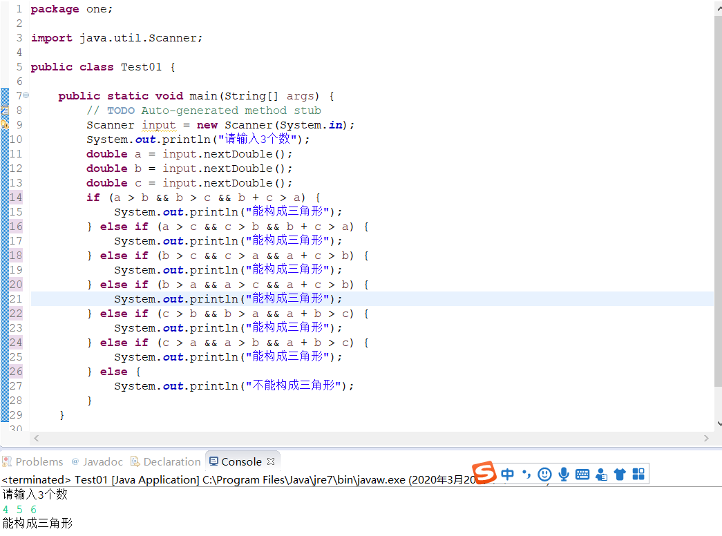 package one; import java.util.Scanner; public class Test01 { public static void main(String[] args) { // TODO Auto-generated method stub Scanner input = new Scanner(System.in); System.out.println("请输入3个数"); double a = input.nextDouble(); double b = input.nextDouble(); double c = input.nextDouble(); if (a > b && b > c && b + c > a) { System.out.println("能构成三角形"); } else if (a > c && c > b && b + c > a) { System.out.println("能构成三角形"); } else if (b > c && c > a && a + c > b) { System.out.println("能构成三角形"); } else if (b > a && a > c && a + c > b) { System.out.println("能构成三角形"); } else if (c > b && b > a && a + b > c) { System.out.println("能构成三角形"); } else if (c > a && a > b && a + b > c) { System.out.println("能构成三角形"); } else { System.out.println("不能构成三角形"); } } }