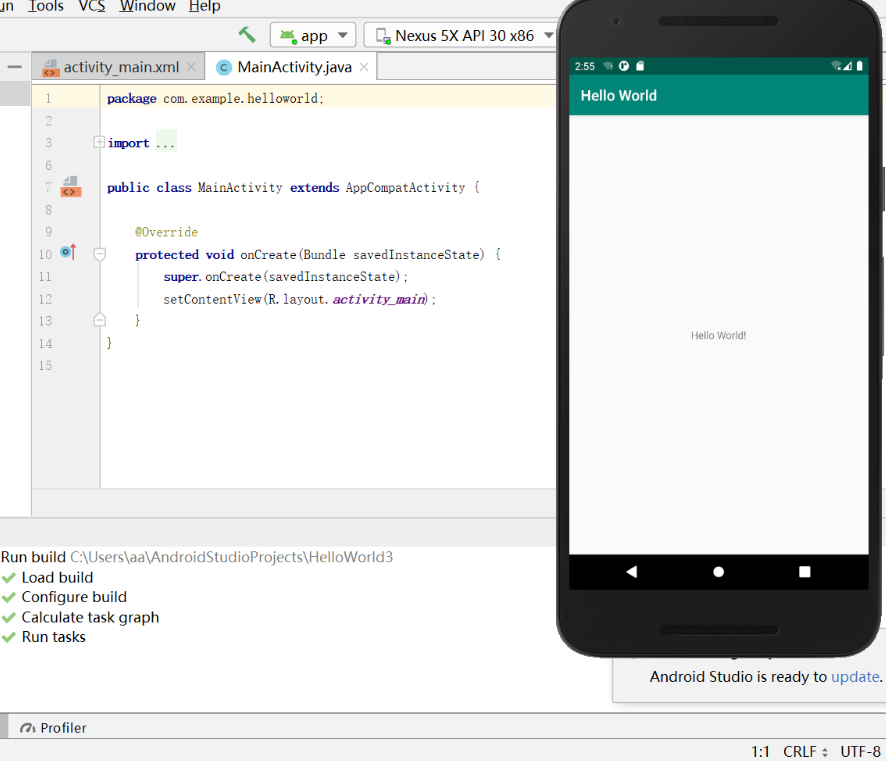 安装android studio开发环境,并运行出一个helloworld程序(真机或模拟器运行),并截图