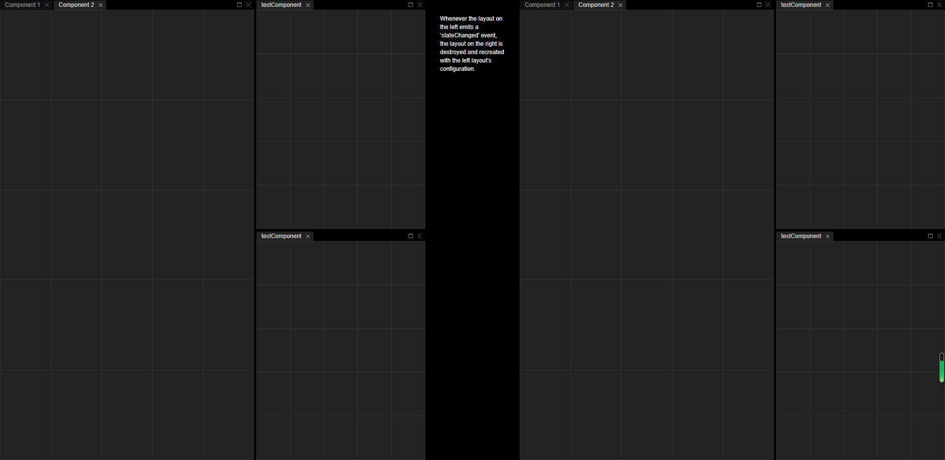 <div id="wrapper"> <div class="layoutA"></div> <div class="controls"> <p> Whenever the layout on the left emits a ‘stateChanged’ event, the layout on the right is destroyed and recreated with the left layout’s configuration. </p> </div> <div class="layoutB"></div></div> |