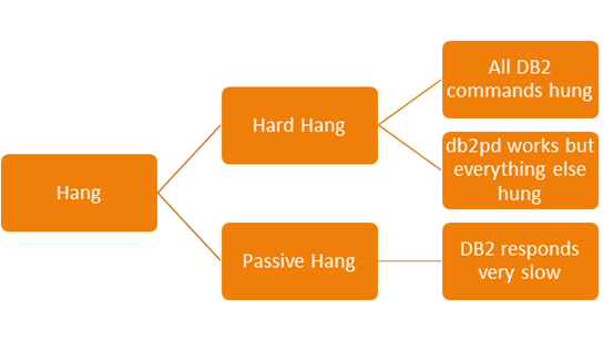 ii. Passive Hang: DB2 引擎有响应,但速度非常缓慢。而 OS 命令则运行良好,没有任何延迟。如: db2 "list applications" 需要几分钟才能返回值。系统相关命令 vmstat/iostat/top/topas 命令显示没有任何问题。