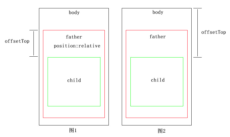2. offsetParent:距离元素最近的一个具有定位的祖宗元素(relative,absolute,fixed),若祖宗都不符合条件,offsetParent为body。如下图所示:获取child的offsetTop,图1的offsetParent为father,图2的offsetParent为body。