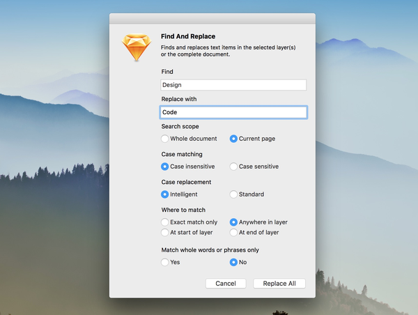 下载地址:GitHub - mscodemonkey/Sketch-Find-And-Replace: Sketch 3 plugin to do a find and replace on text within layers