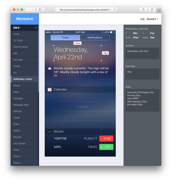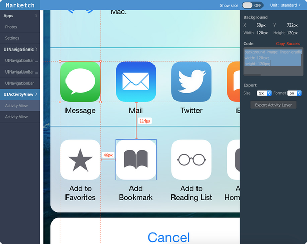 ——Zeplin是一个神器,但是很多公司(尤其是大公司)出于商业机密的考虑不允许设计师使用在线的Spec标注软件,Marketch就是一个几乎完美的替代品,它是一个可交互的Spec文档,选择某个元素后,各项尺寸都会显示出来,右边栏甚至还有写好的CSS Code。自从用了它,和我厂的工程师沟通腰也不疼了、腿也不酸了!