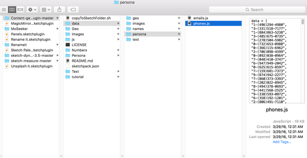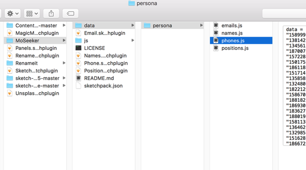 1.打开 Sketch Plugin 的文件夹,Content-generator-sketch-plugin-master/data/persona 你会发现邮箱和手机号是两个 json 文件。(把他看成 excel 一条条存储数据吧)