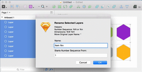 ——用于快速重命名图层,比如可以使用例如「%n」这样的语法快速命名一个连续列表,也可以自动使用图层尺寸来给图层命名,可以很方便地使用「ABC Icon 36px * 36px」来导出Asset文件。