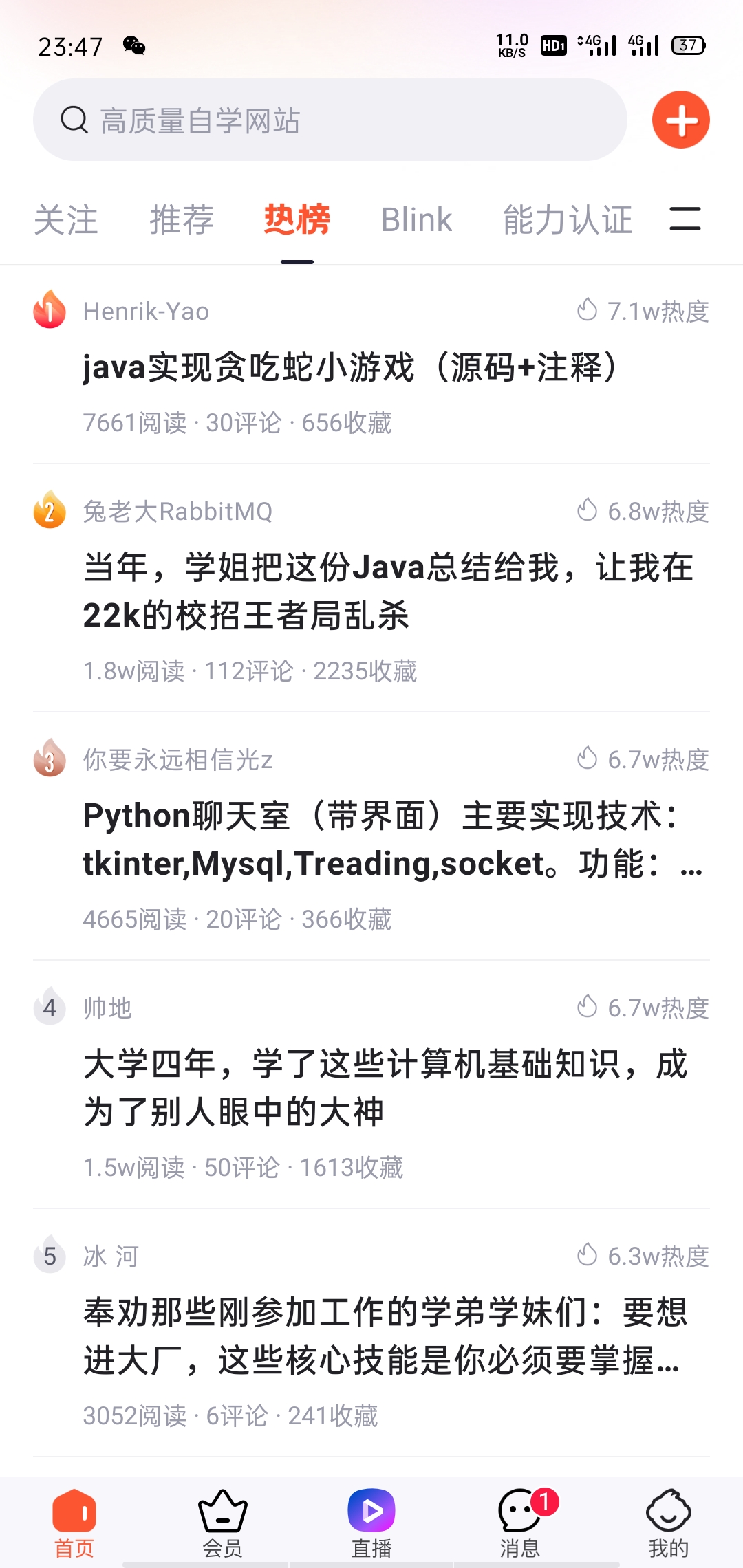 打开app进入首页界面,先看到的是推荐页面,这里可以看到CSDN热榜和阅读量比较多的博客,也可以看到自己关注的博主的动态、热度榜、Blink和能力认证等等。在首页上的搜索框可以检索自己想要的信息。热榜这一部分一般设计为软件的主要功能,可以查看比较高的阅读量的内容,热度根据点击、评论、收藏来决定。Blink就是可以发表一些问题让全站的用户都能看到和评论。关注可以查看自己想看的自己对某个学霸感兴趣的博文。
