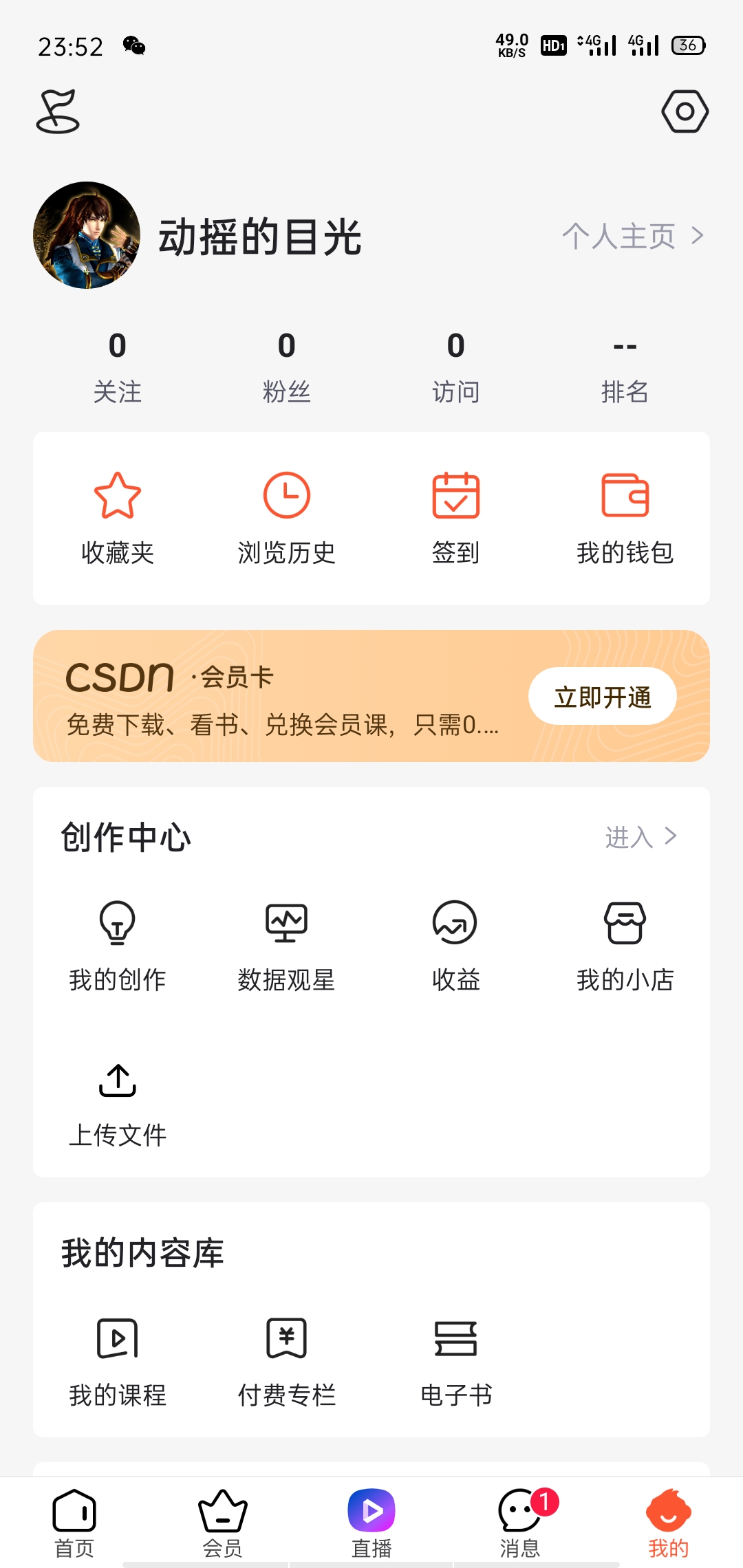 点击我的进入我的界面,可以进行登录,可以查看收藏夹、浏览历史和钱包,可以签到打卡。可以查看关注过的博主、自己的粉丝、访问量和排名。