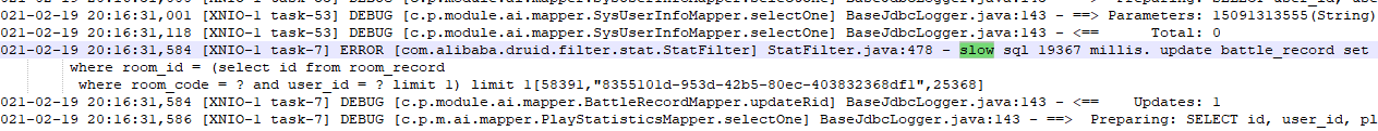 1.在sql日志的打印中,喜不自胜的看到了一连串了slow 慢sql语句,这下子可以从这些sql语句上着手的,这是肯定要优化的,都是一些执行时间大于1s的,更有甚者到达了5-6s。
