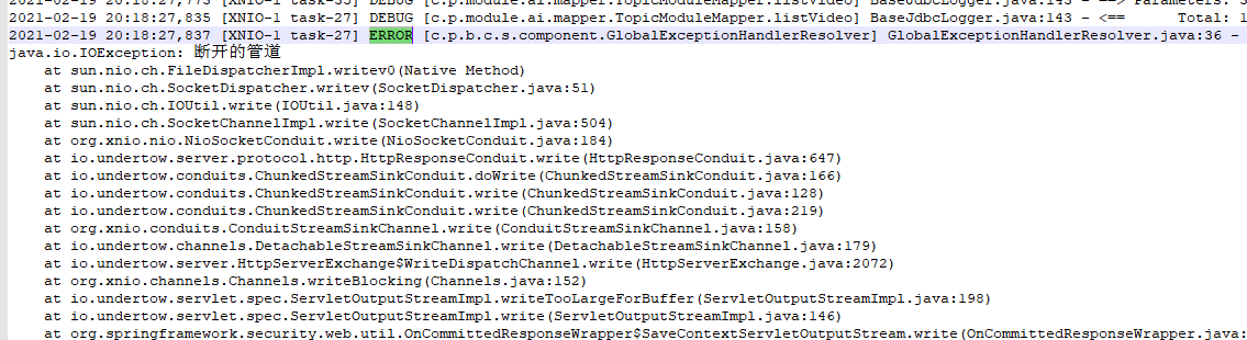 在这里面的文章里找到一些有用的内容,原来是因为接口响应过慢,导致前端那边设置的超时时间到了,直接主动切断了与后端的连接,但是后端还在查数据,查完以后想返给前端,发现管道已经断掉了,就只好报这个错误的