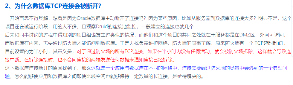 打开druid.keepAlive之后,当连接池空闲时,池中的minIdle数量以内的连接,空闲时间超过minEvictableIdleTimeMillis,则会执行keepAlive操作,即执行druid.validationQuery指定的查询SQL,一般为select * from dual,只要minEvictableIdleTimeMillis设置的小于防火墙切断连接时间,就可以保证当连接空闲时自动做保活检测,不会被防火墙切断