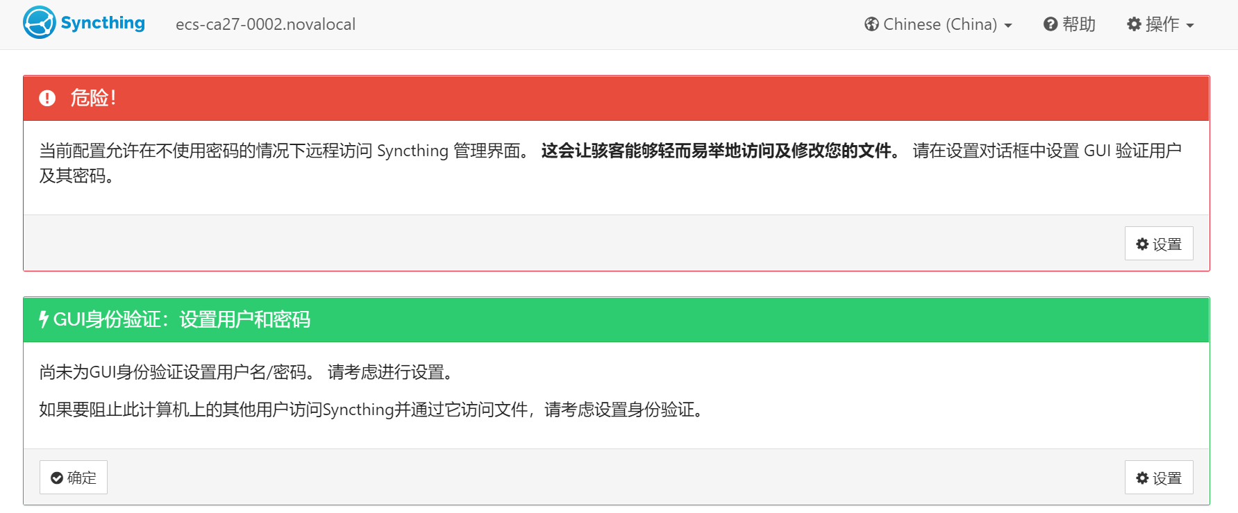 直接输入云的公网IP加端口8384进行验证:http://x.x.x.x:8384/.和第一步中的Windows的界面操作几乎完全一致。(会多一个要求设置用户和密码的弹框,直接设置下就好了)