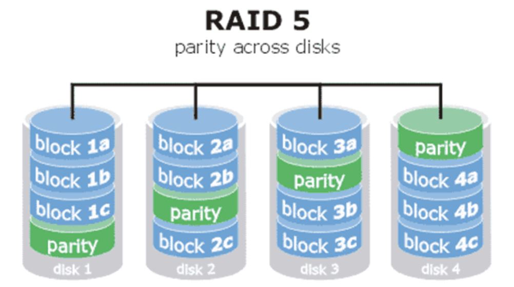 RAID 5(“妥协”地兼顾了硬盘设备的读写速度、数据安全性与存储成本问题):把硬盘设备的数据奇偶校验信息保存到其他硬盘设备中。RAID 5磁盘阵列组中数据的奇偶校验信息并不是单独保存到某一块硬盘设备中,而是存储到除自身以外的其他每一块硬盘设备上,这样的好处是其中任何一设备损坏后不至于出现致命缺陷;parity部分存放的就是数据的奇偶校验信息,RAID 5技术实际上没有备份硬盘中的真实数据信息,而是当硬盘设备出现问题后通过奇偶校验信息来尝试重建损坏的数据。