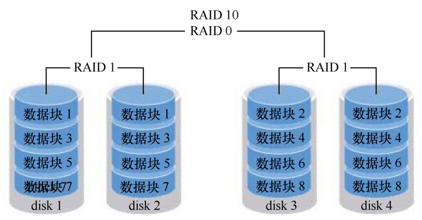 RAID 10(RAID 1+RAID 0技术的“组合体”):需要至少4块硬盘来组建,其中先分别两两制作成RAID 1磁盘阵列,以保证数据的安全性;然后再对两个RAID 1磁盘阵列实施RAID 0技术,进一步提高硬盘设备的读写速度。只要坏的不是同一组中的所有硬盘,那么最多可以损坏50%的硬盘设备而不丢失数据。由于RAID 10技术继承了RAID 0的高读写速度和RAID 1的数据安全性,在不考虑成本的情况下RAID 10的性能都超过了RAID 5,因此当前成为广泛使用的一种存储技术。