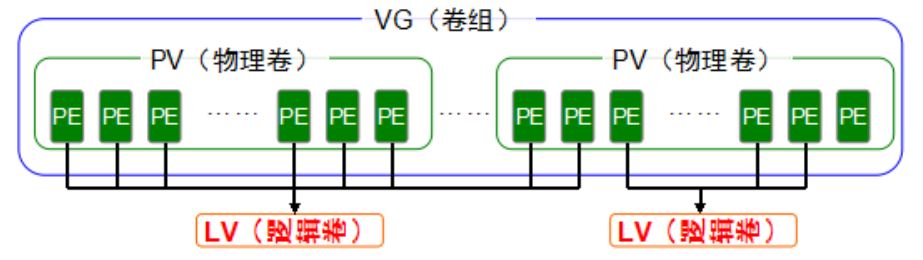 卷组建立在物理卷之上,一个卷组可以包含多个物理卷,而且在卷组创建之后也可以继续向其中添加新的物理卷;