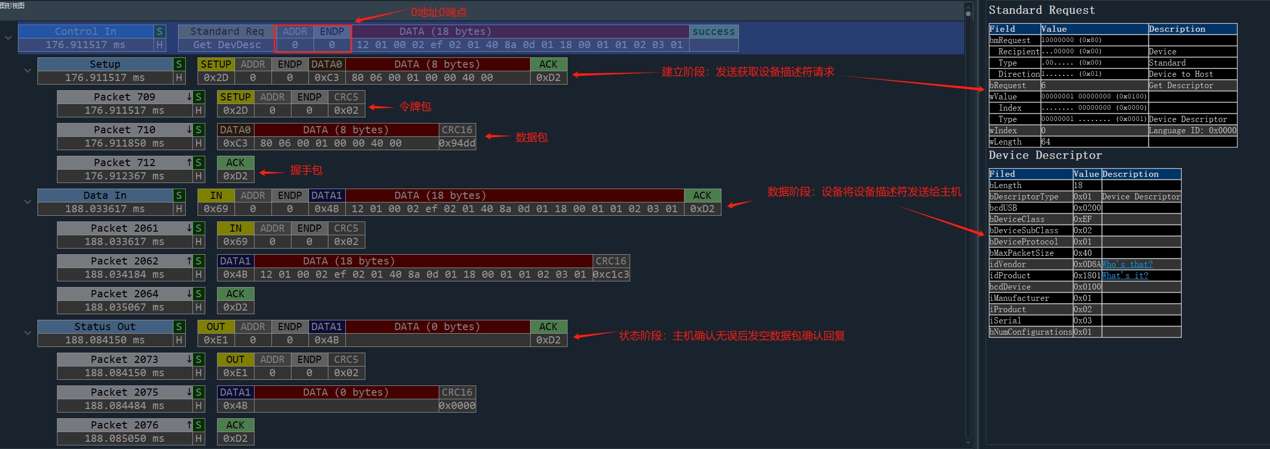 设备得到请求以后就会按照主机的要求将设备描述符发送给主机,主机得到设备发送过来的设备描述符以后,如果确认无误就会向设备返回一个空数据包回复。