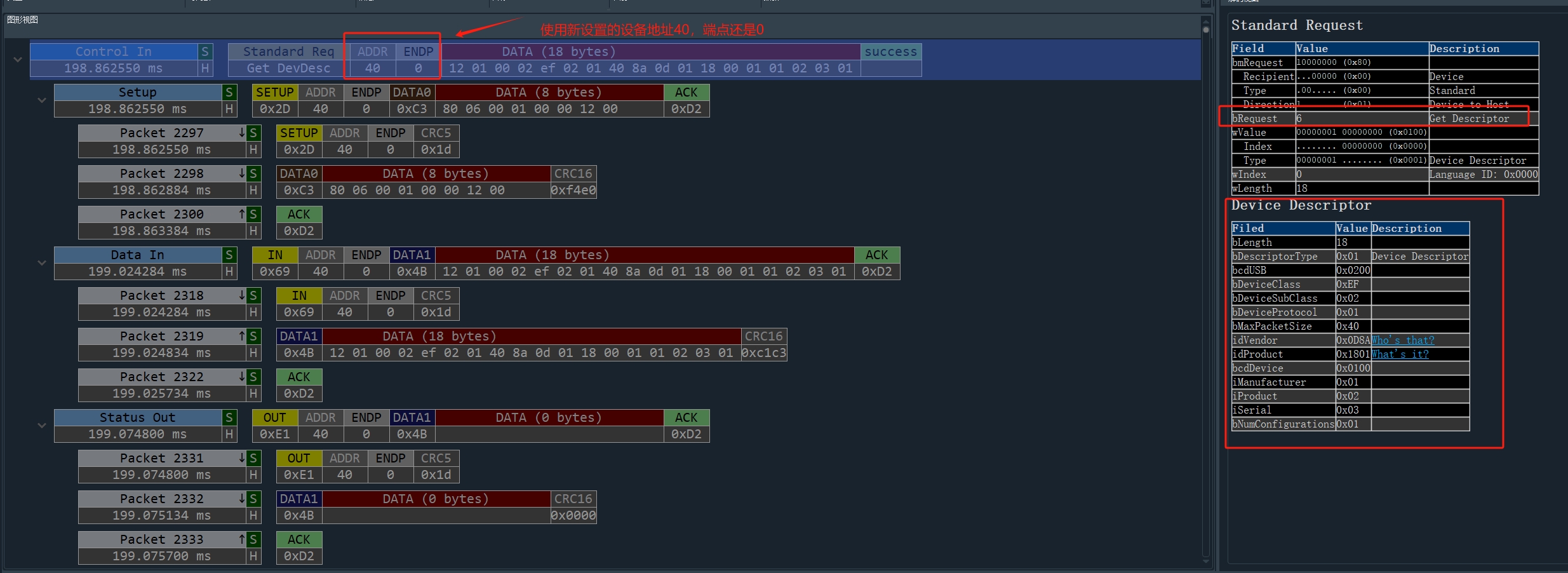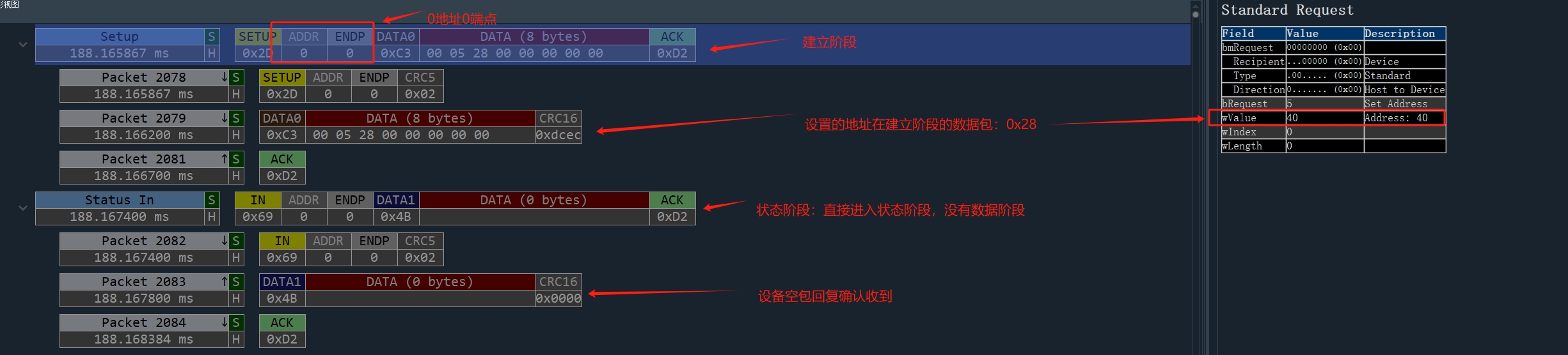 已经设置好地址了,主机收到这个0 字节状态数据包以后会返回一个确认包(ACK)。设备收到