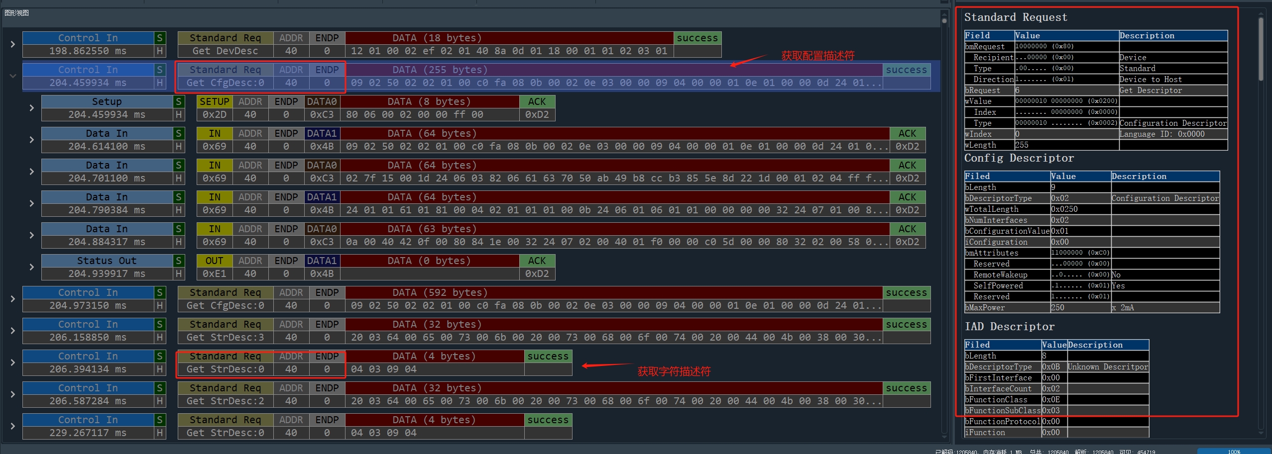 4. 和第3步类似,接下来依次获取配置描述符、配置集合、字符串描述符等等。