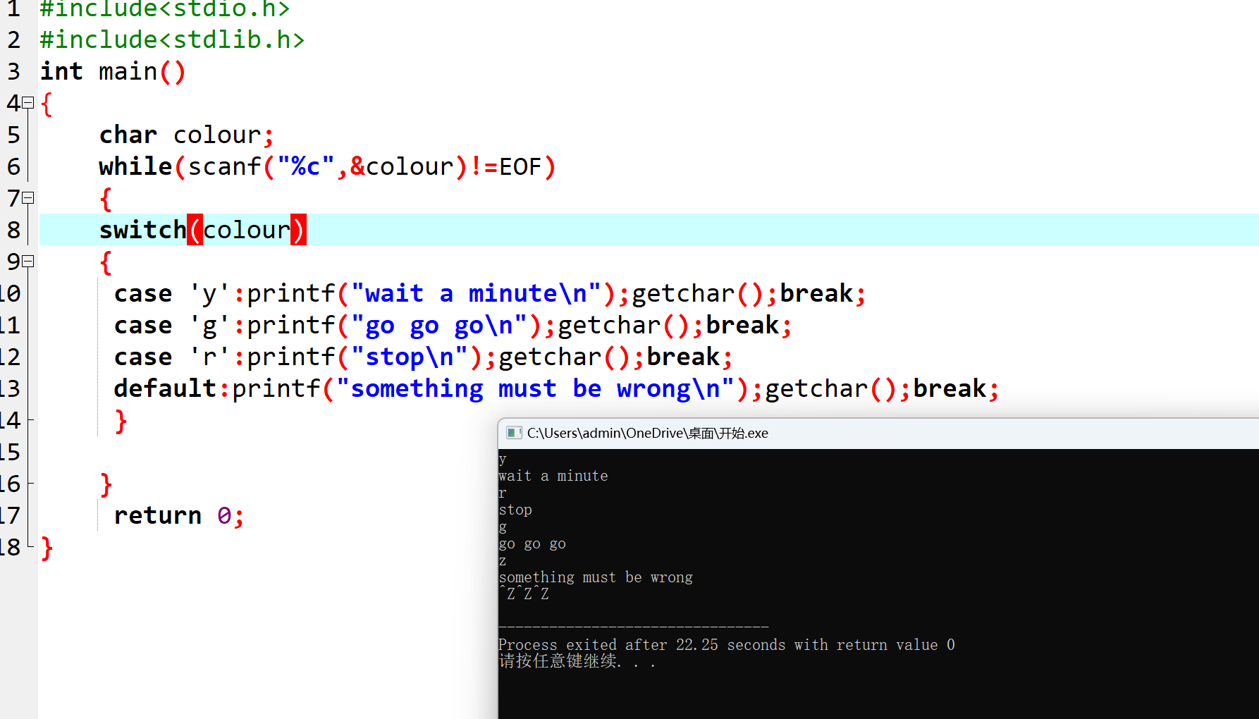#include<stdio.h> #include<stdlib.h> int main() { char colour; while(scanf("%c",&colour)!=EOF) { switch(colour) { case 'y':printf("wait a minute\n");getchar();break; case 'g':printf("go go go\n");getchar();break; case 'r':printf("stop\n");getchar();break; default:printf("something must be wrong\n");getchar();break; } } return 0; }