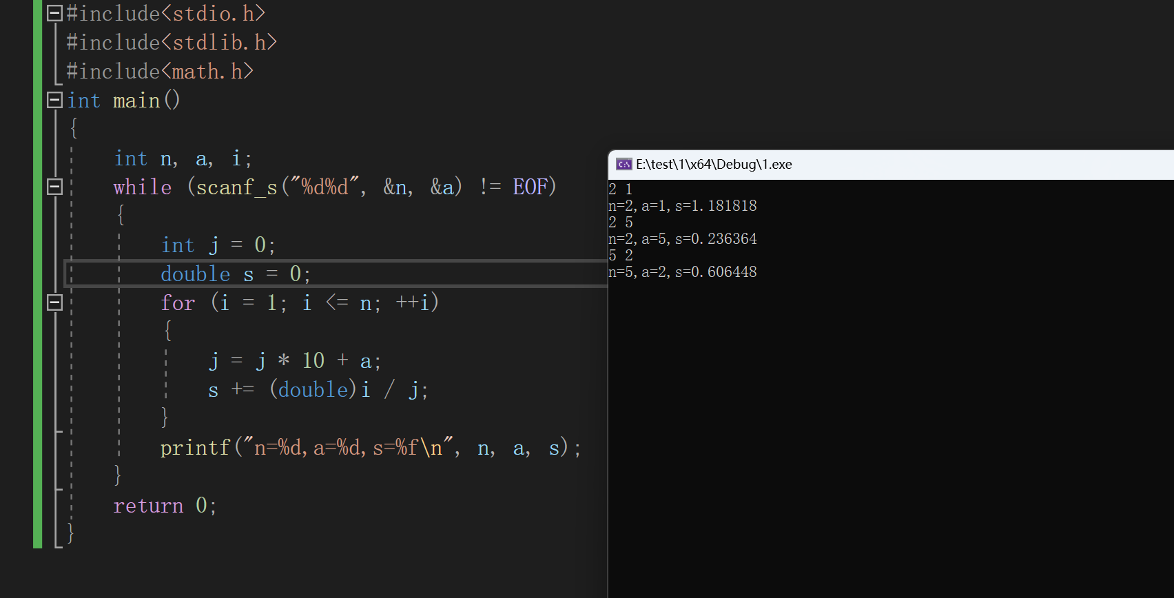 #include<stdio.h> #include<stdlib.h> #include<math.h> int main() { int n, a, i; while (scanf_s("%d%d", &n, &a) != EOF) { int j = 0; double s = 0; for (i = 1; i <= n; ++i) { j = j * 10 + a; s += (double)i / j; } printf("n=%d,a=%d,s=%f\n", n, a, s); } return 0; }