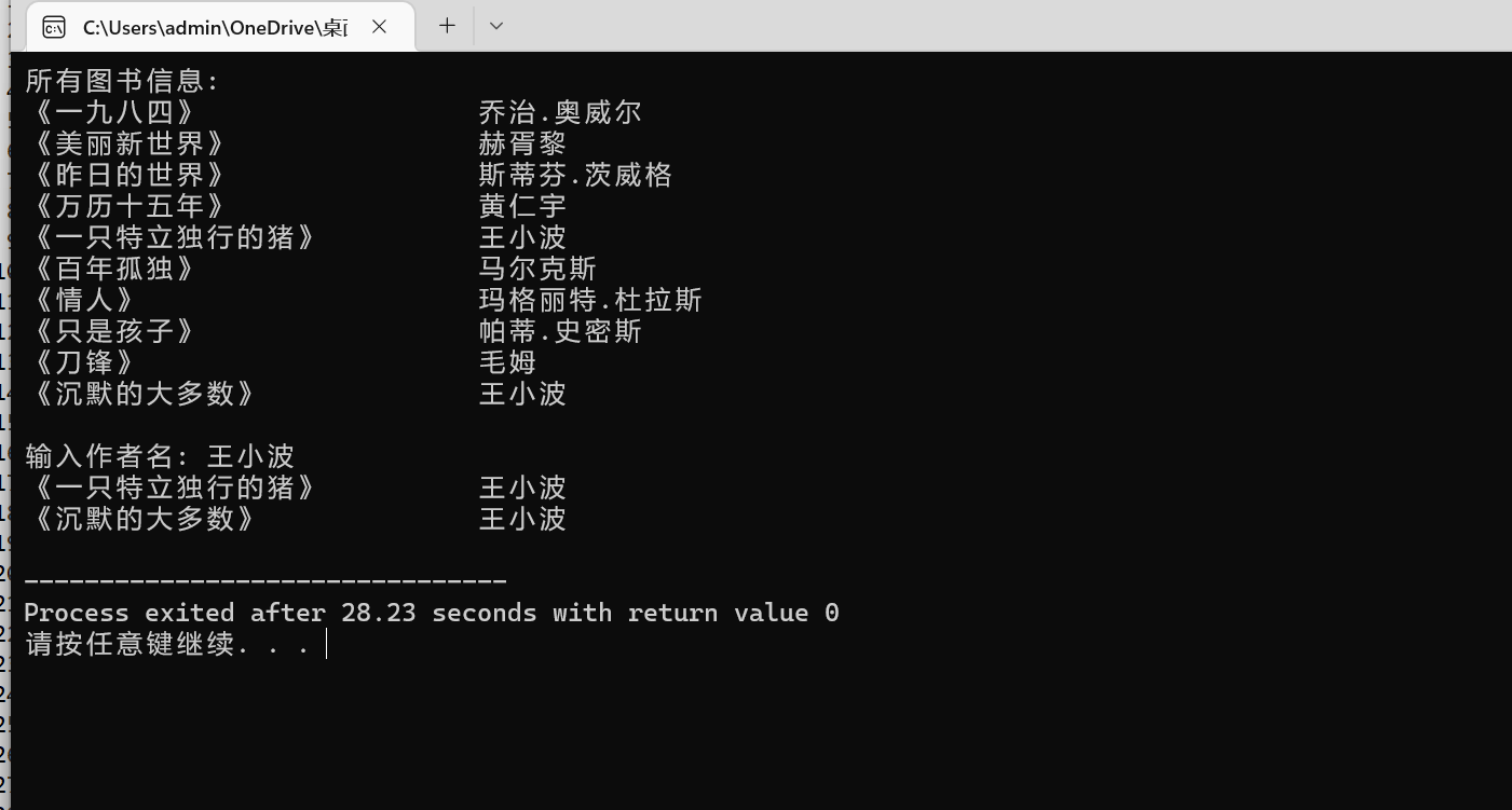 #include <stdio.h> #include <string.h> #define N 10 #define M 80 typedef struct { char name[M]; char author[M]; } Book; int main() { Book x[N] = { {"《一九八四》", "乔治.奥威尔"}, {"《美丽新世界》", "赫胥黎"}, {"《昨日的世界》", "斯蒂芬.茨威格"}, {"《万历十五年》", "黄仁宇"}, {"《一只特立独行的猪》", "王小波"}, {"《百年孤独》", "马尔克斯"}, {"《情人》", "玛格丽特.杜拉斯"}, {"《只是孩子》", "帕蒂.史密斯"}, {"《刀锋》", "毛姆"}, {"《沉默的大多数》", "王小波"} }; Book *ptr; int i; char author[M]; printf("所有图书信息: \n"); for(ptr = x; ptr < x + N; ++ptr) printf("%-30s%-30s\n", ptr->name, ptr->author); printf("\n输入作者名: "); gets(author); for(ptr = x; ptr < x + N; ++ptr) if(strcmp(ptr->author, author) == 0) { printf("%-30s%-30s\n", ptr->name, ptr->author); } return 0; }