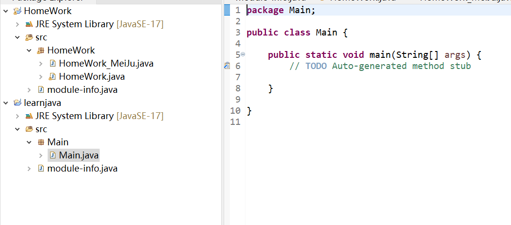 - 观察:项目的src目录与bin目录。尝试命令行下运行bin目录中的.class文件。
