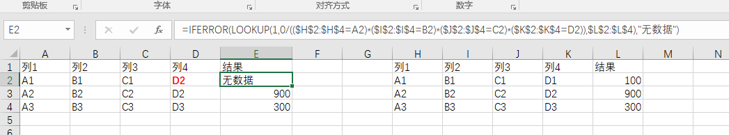 =IFERROR(LOOKUP(1,0/(($H$2:$H$4=A2)*($I$2:$I$4=B2)*($J$2:$J$4=C2)*($K$2:$K$4=D2)),$L$2:$L$4),"无数据")