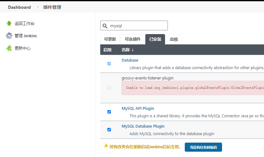 线下安装插件需安装:mysql-api.hpi、database-mysql.hpi、database.hpi