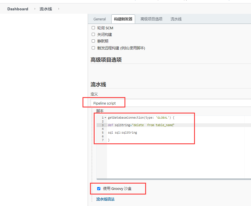 在流水线工程中选择Pipeline script脚本,编写对应的Groovy脚本来操作数据库,并勾选使用Groovy沙盒