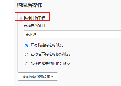 在【增加构建后操作步骤】中选择“构建其他工程”,然后填写要构建的工程名称即可,若是有多个工程,用英文格式的逗号分隔开。