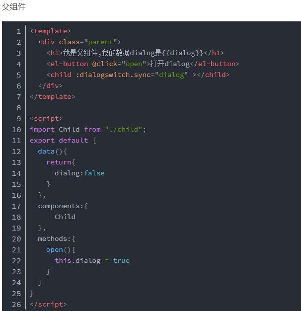 父组件通过:dialogswitch.sync绑定prop到子组件,实现父组件传递数据到子组件