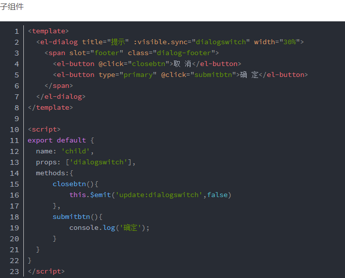 子组件使用this.$emit( 'update:dialogswitch', 更新的数据 )修改父组件的数据, 实现子组件修改父组件数据