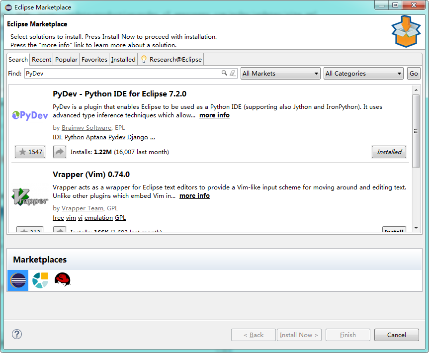 - 安装Eclipse的Python插件PyDev:Help->Eclipse Marketplace,输入PyDev搜索后点install;
