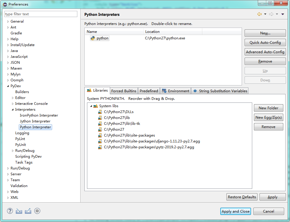 安装之后需给PyDev配置Python解释器:Window->Preferences,找到后可直接在Quick Auto-Config中快速识别添加;
