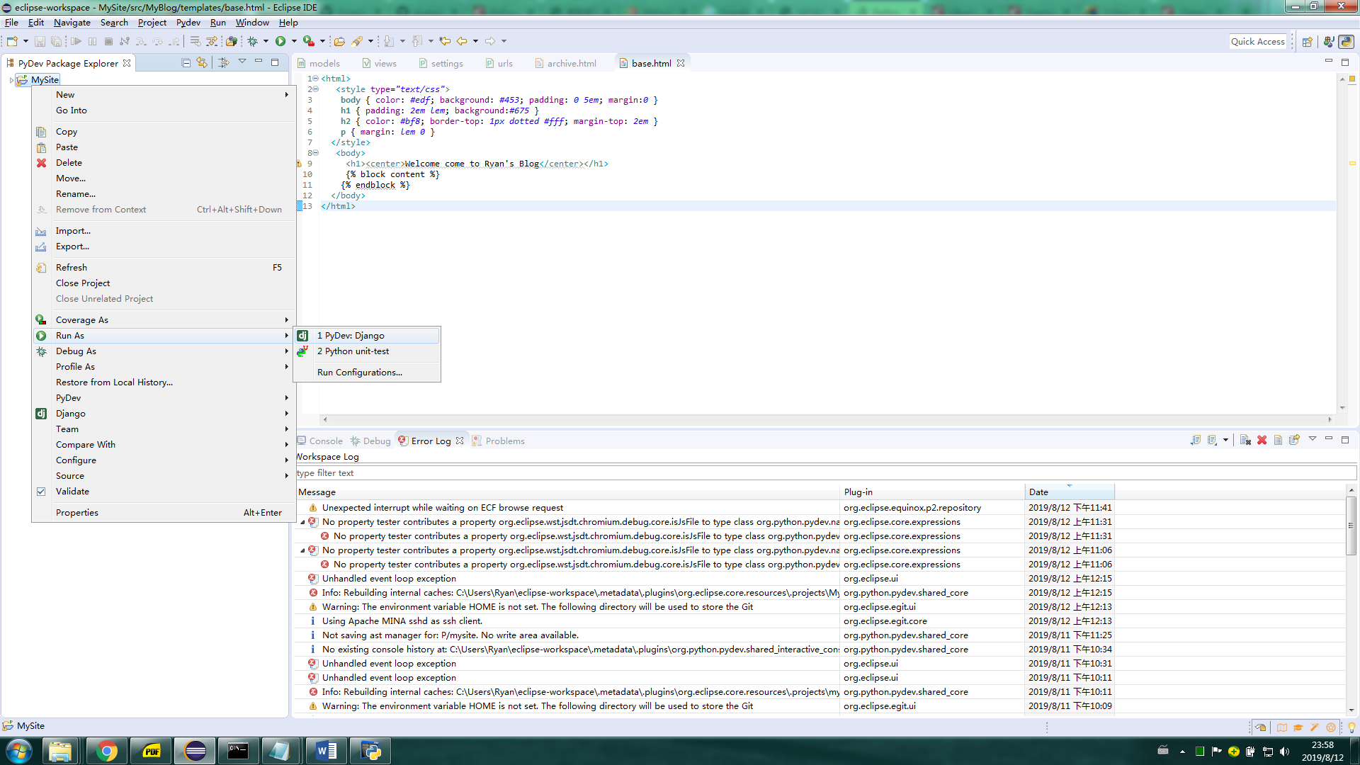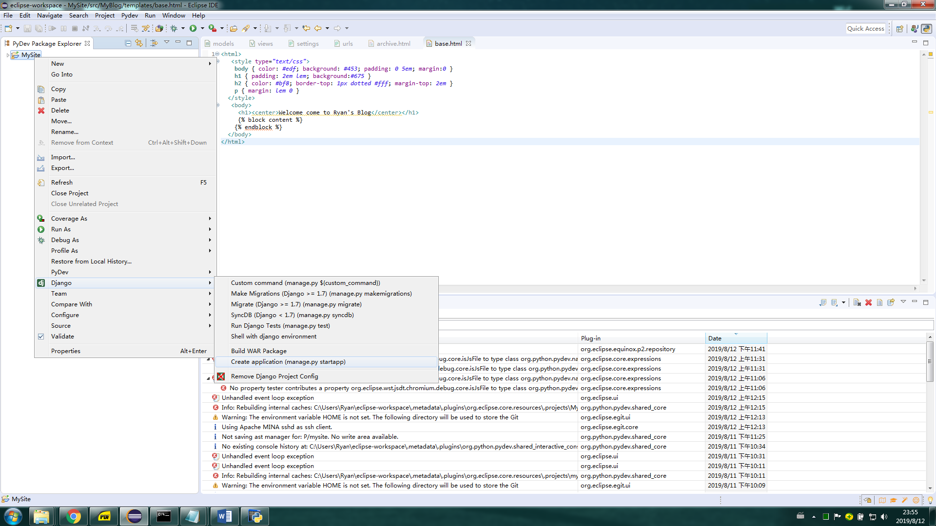 环境:python2.7.16 + Django1.11.23 + Eclipse 2019-06 (4.12.0)