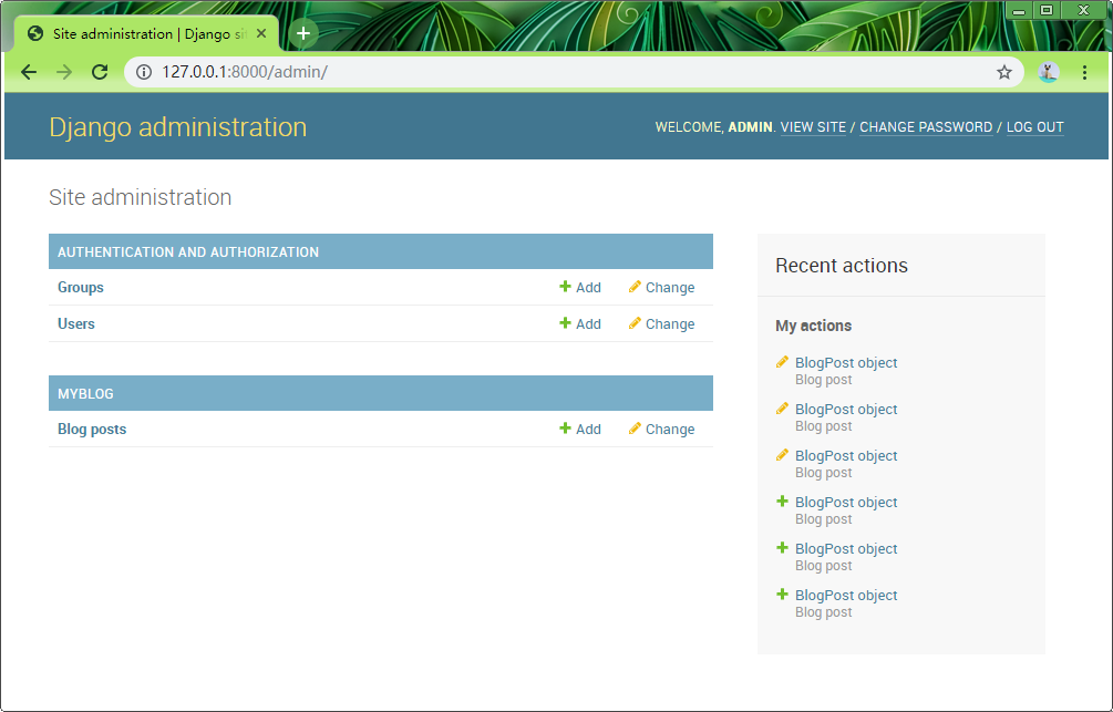 在MYBLOG输入内容保存即可发布,输入网址:http://127.0.0.1:8000/MyBlog测试成功!